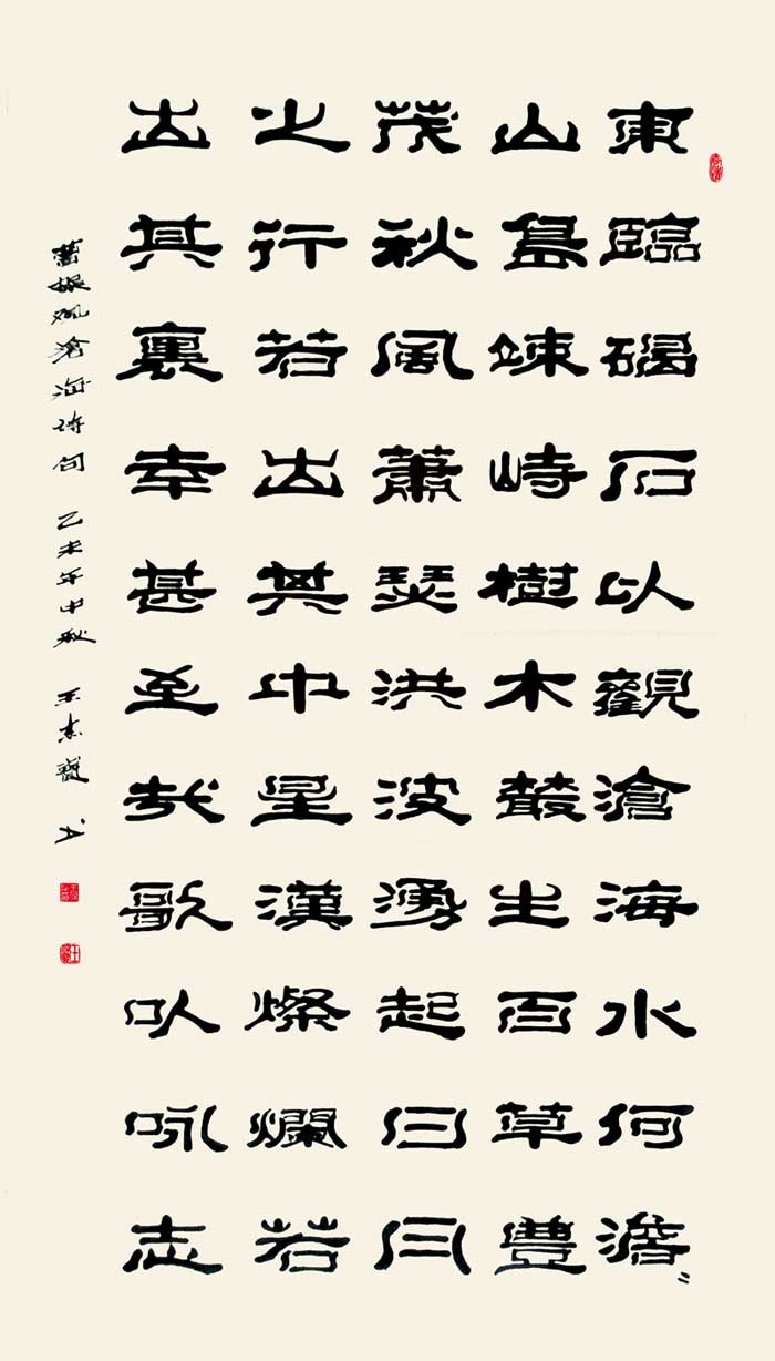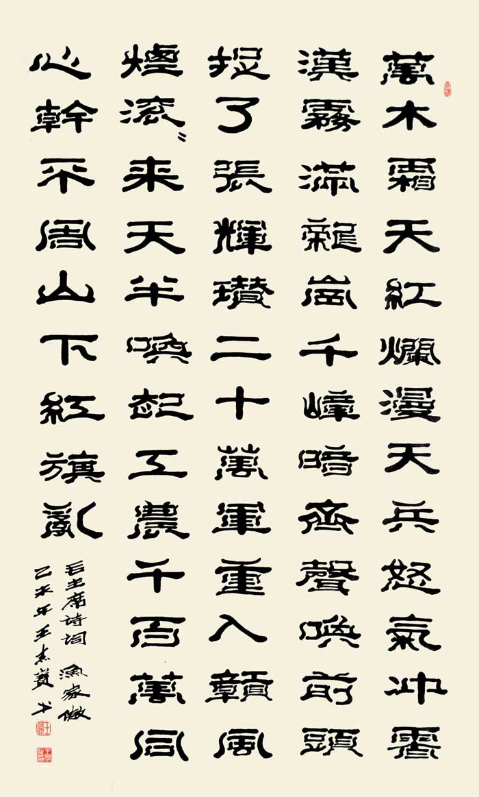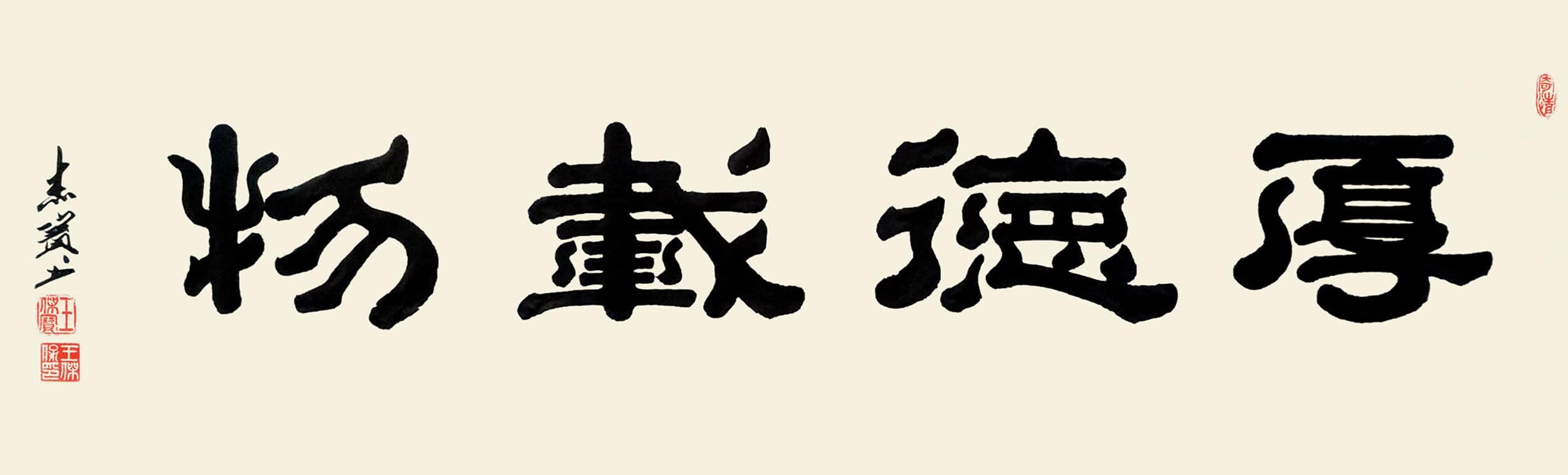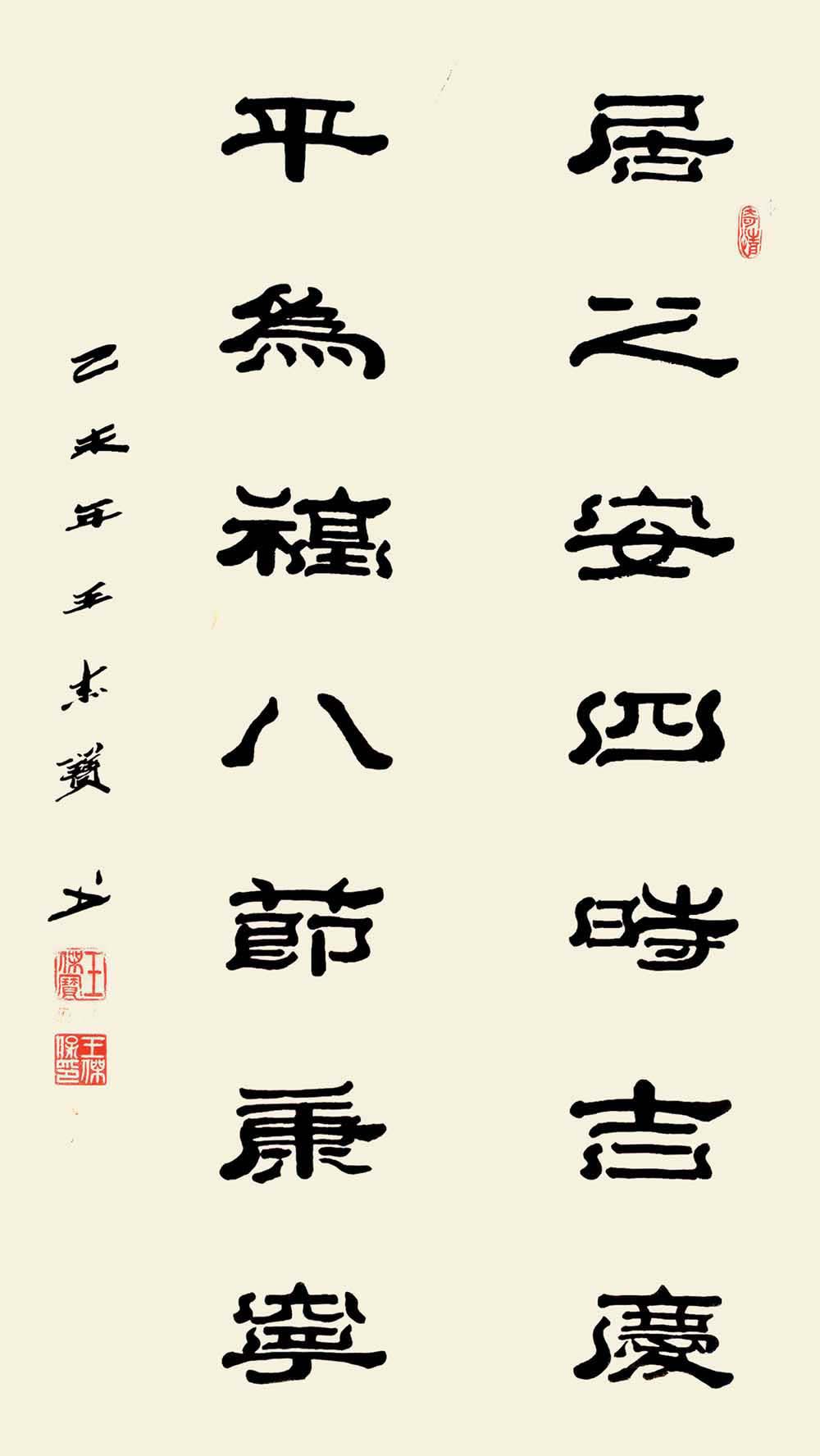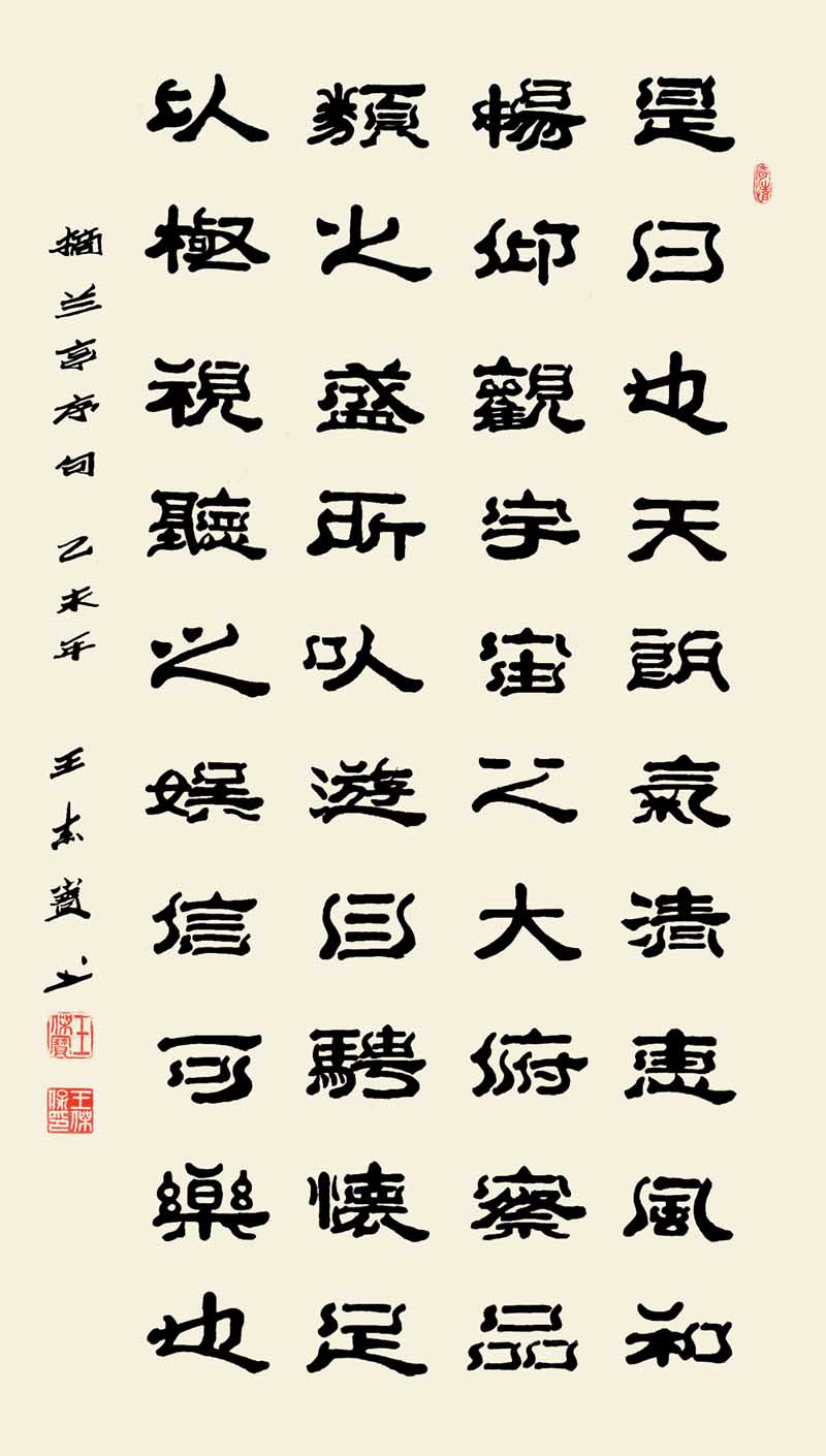赏王先生之作,落笔透力遒劲,着墨取“逆入平出”之势,却让逆势之形迹不露于外,观之自然柔和;结体在规正中现巧丽风姿,其字势开阔,偃仰分明,向背有致,呈谨严素朴,古雅正厚的审美旨趣。而在赏析王先生研新之作时,会看到在其稳厚的师古足迹中闪耀出的,心裁别出之焕然墨韵。“王氏笔墨”新变,可谓将隶体“一波三折”之笔法运用到极致,不论横笔竖笔,大都以“弧波”之法而为,打破了隶书常态,但却因笔力深透稳健,着墨自然流顺体现出“波折”虽多,却不显繁累和俗庸的中和之美。加之在个别字上的处理又运用篆书结构加以点缀,使通篇作品渗透着流利自如,姿致萧散的墨趣。呈现出丰美多姿,变化无穷之魅力,让观者在目不暇接的同时更流连忘返。