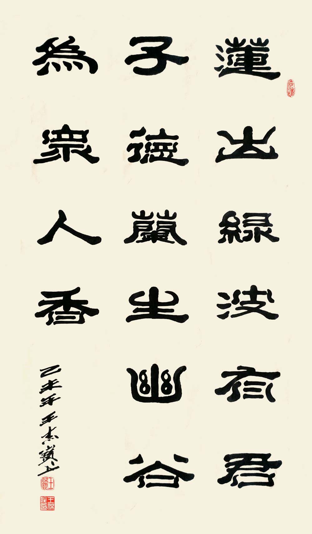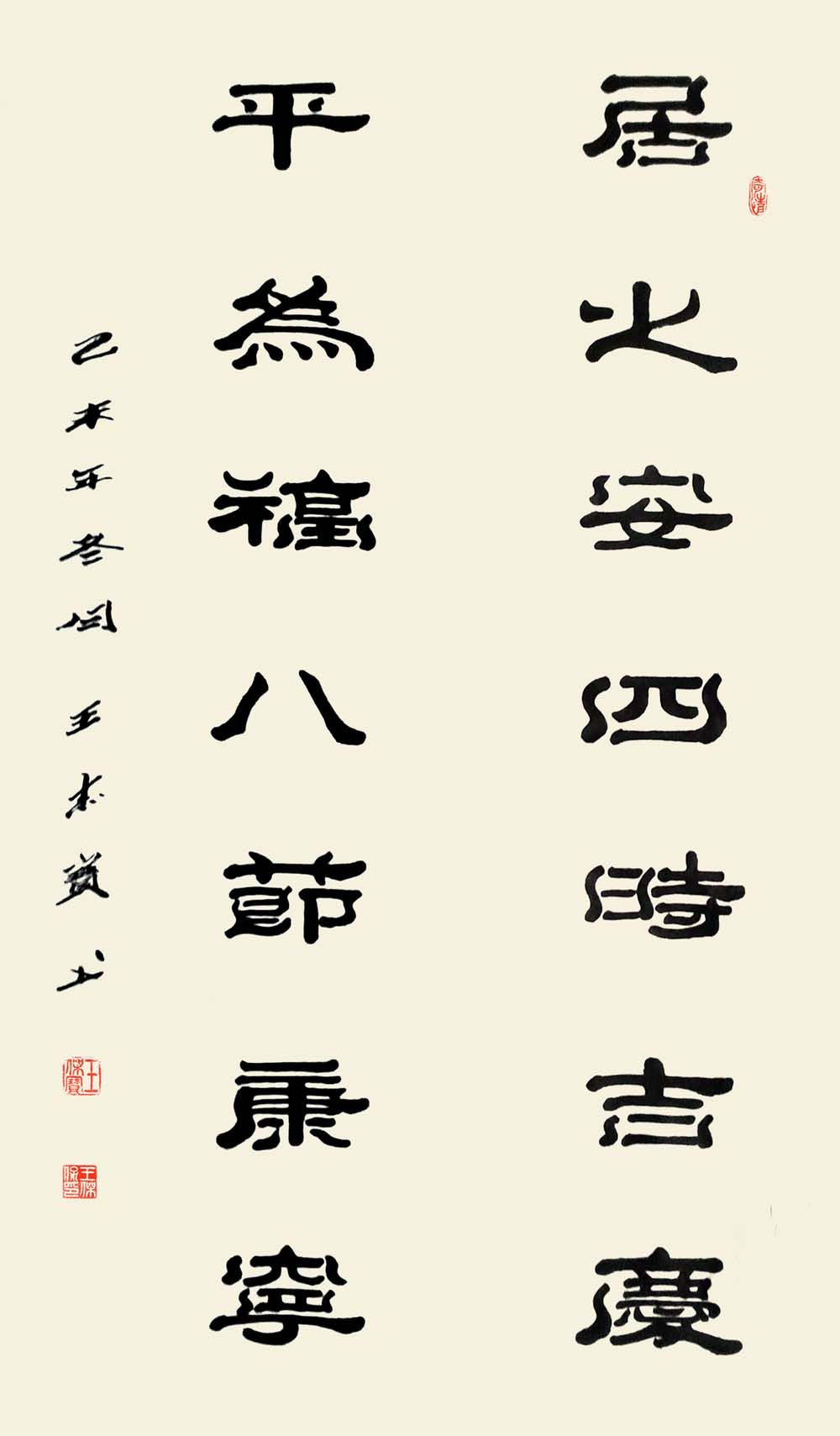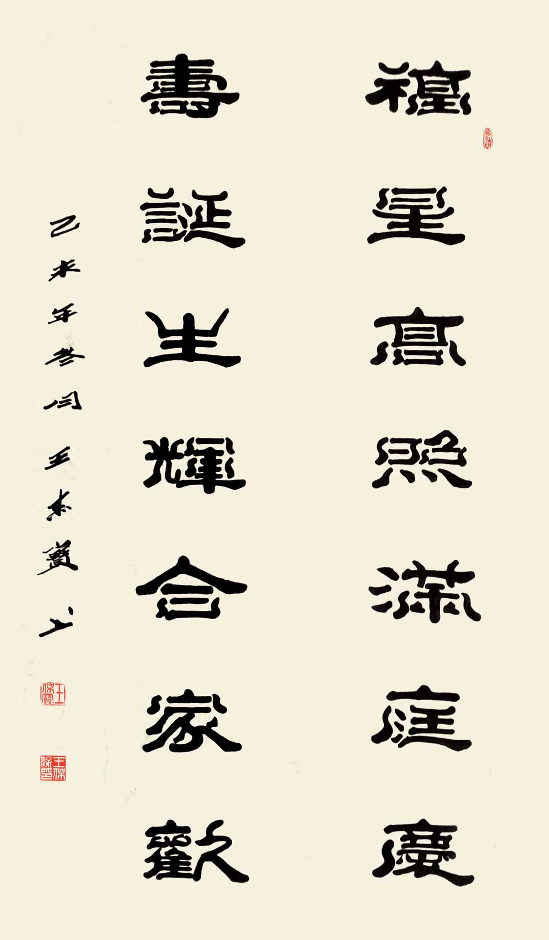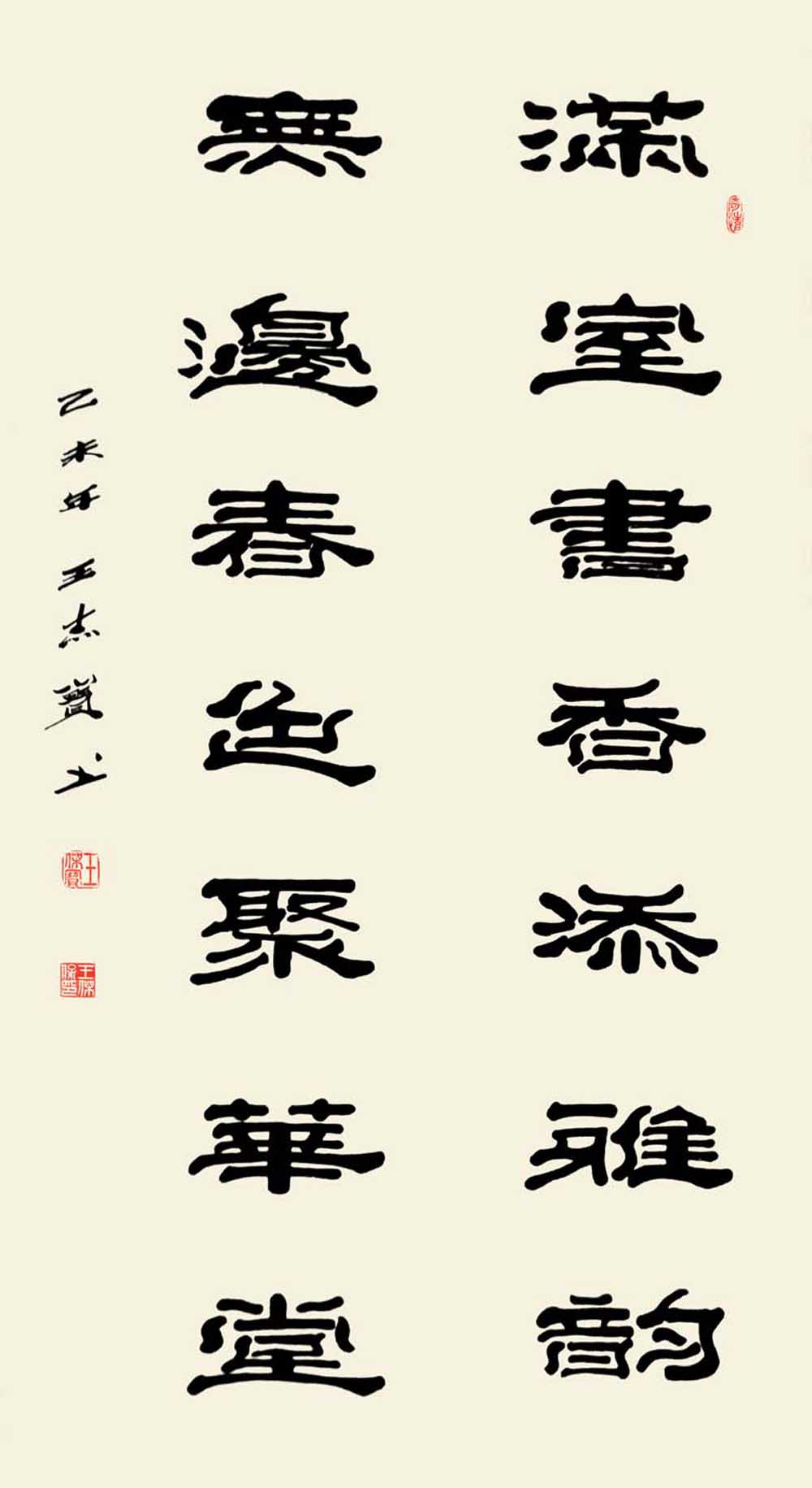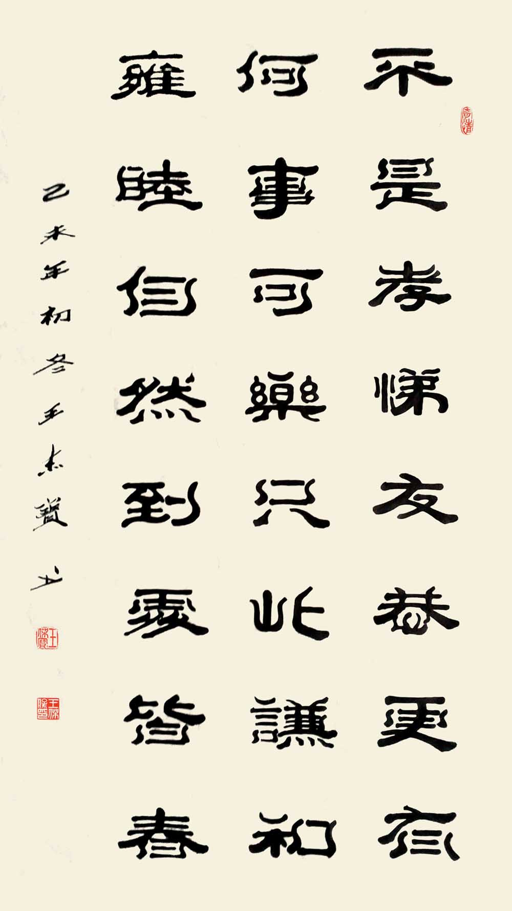 赏王先生之作,落笔透力遒劲,着墨取“逆入平出”之势,却让逆势之形迹不露于外,观之自然柔和;结体在规正中现巧丽风姿,其字势开阔,偃仰分明,向背有致,呈谨严素朴,古雅正厚的审美旨趣。而在赏析王先生研新之作时,会看到在其稳厚的师古足迹中闪耀出的,心裁别出之焕然墨韵。“王氏笔墨”新变,可谓将隶体“一波三折”之笔法运用到极致,不论横笔竖笔,大都以“弧波”之法而为,打破了隶书常态,但却因笔力深透稳健,着墨自然流顺体现出“波折”虽多,却不显繁累和俗庸的中和之美。加之在个别字上的处理又运用篆书结构加以点缀,使通篇作品渗透着流利自如,姿致萧散的墨趣。呈现出丰美多姿,变化无穷之魅力,让观者在目不暇接的同时更流连忘返。