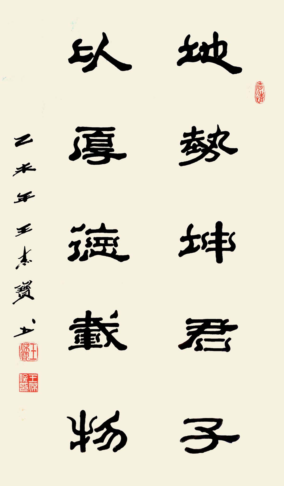 观王先生作品,从承古来讲,他习研众家,堪称功夫深厚。以笔者之审美感受而言,觉其隶书多有《史晨》和《乙瑛》之风韵。《史晨碑》为东汉后期汉隶走向规范,成熟的典型。对于《史晨》之论,明郭宗昌在《金石史》中云:“分法复尔雅超逸,可为百代模楷,亦非后世可及。”《乙瑛碑》则是汉隶成熟时期的典型力作,对《乙瑛》之见,著名书法家何绍基评曰:“朴翔捷出,开后来隽丽一门,然肃穆之气自在。”而二碑沉雄稳健,流畅洒逸之风姿特点,王杰宝先生都将其淋漓渗透在了自己的笔墨参悟中。
