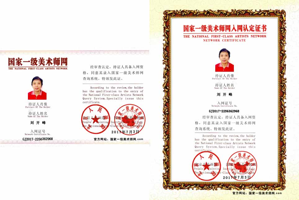 刘开峰,字长隆,湖南常德人。1987年毕业于江苏无锡书法艺专,高级技师;长期在416事业单位从事宣传工作。擅长书法,国画及金石篆刻;书画作品多次在各大报刊,杂志发表并被个人收藏;2016进修于中国人民大学画院高研班;现为清华大学美术学院赵金工作室画家,中国书画家协会会员,录入国家一级美术师网。