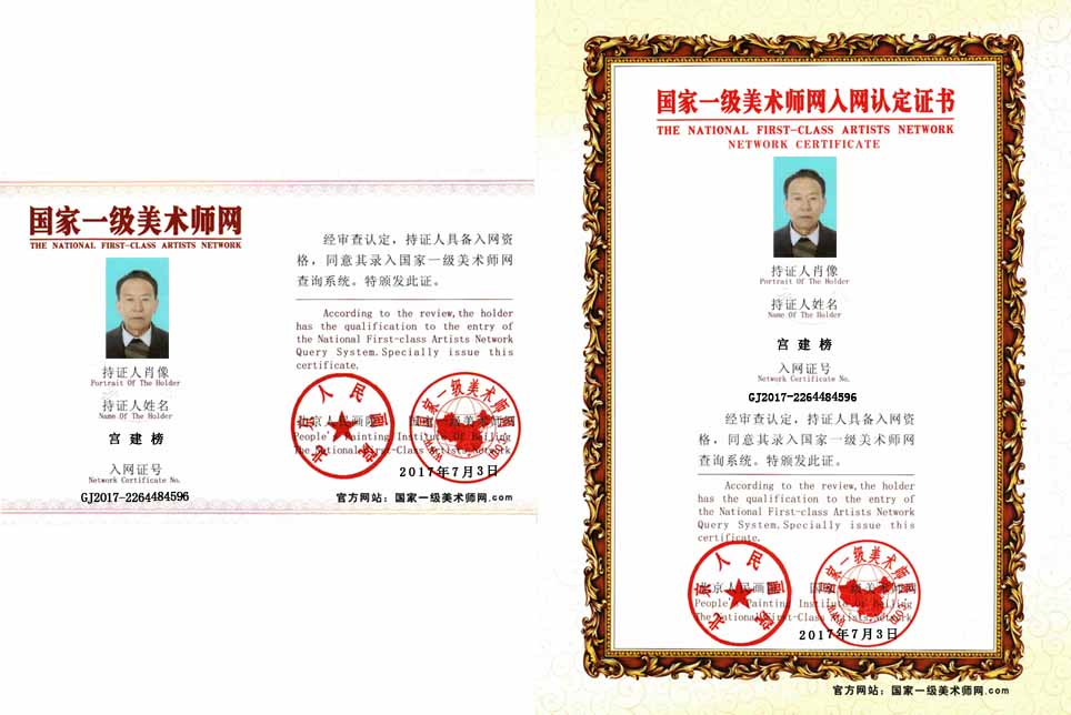 宫建榜:字号艺德堂。1956年出生于河北衡水地区,深州人。现任深州市美协会员,衡水美协会员,河北省美协会员。 1985年毕业于石家庄山水画专修班。师从著名画家葛治国,多次参加活动并获奖。分别荣获:2014年“桃乡清风”三等奖;“迎七一颂党恩”二等奖;“纪念甲午战争120周年”获一等奖;2015年“盛世和谐建设美丽乡村”获二等奖;2016年”庆祝中国共产党成立95周年”获特等奖。北京市朝阳区华辉苑文化园特聘画家。2016年就读于中国人民大学画院赵金工作室。