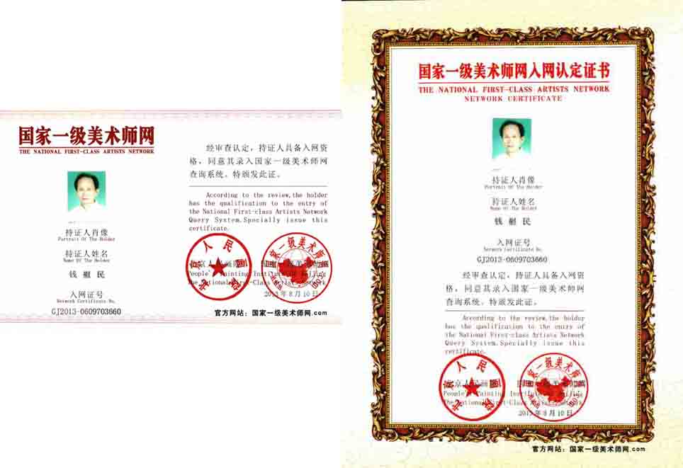 中国书画研究会副会长,一级书画师;