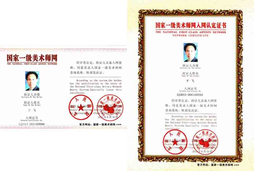 于飞,字浩泉。祖籍天津,生于辽宁绥中。现任:中国文联民间文艺家协会会员、国家一级美术师,中国国家书画院理事、中国美术家协会网签约画家、辽宁美术家协会绥中百年梨园美术培训辅导基地主任、艺术辅导教师,辽宁美术家协会会员、中国国家林业局书法家协会、美术家协会理事、葫芦岛分会主席,出版有天津人民美术出版社【于飞国画作品集•写意集】【于飞国画作品集•工笔集】中国画山水画技法教材【于飞中国画技法】国画作品多次参加国内外专业画展及中韩,中日书画交流展并获金银奖几十次。部分作品收录于《当代名家》、《中国画名家作品集》、《国画家》等几十部书籍,众多作品收藏于中央党校、中国国画研究院、世乔联合会,文化部艺术品档案局,英国皇家美术馆及国际友人,多次被国家文化部、文化市场鉴定评定中心及专业职能部门评定为“最具潜力艺术家”、“中国画实力派画家”、“中华国画百杰”称号。