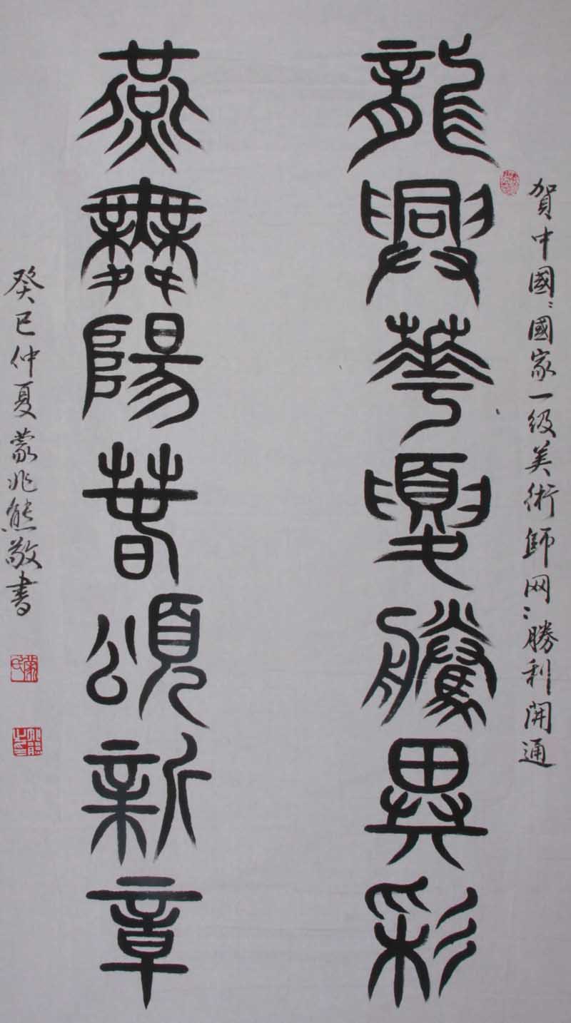 曾有多由书作在国家级以及国际上发表,并在网上传播展示。书艺以传统为根基,经不断研修及探索,最终形成个人风格,同时各种字体(隶、楷、行、草、尤擅篆书)均有校深层次的造诣,在创作中,用笔简洁济,章法考究规范,无论谋篇造势或是笔墨渲染,都能显现出深厚的功力和娴熟笔法,创造性实现了艺术境界与表达手法,从自由王国与现实空间的和谐统一。无处不是邀请流露与灵感流露,从而,折射出馨香的品德和高尚志向,并给人们一种极大的艺术享受和精神上的鼓舞。