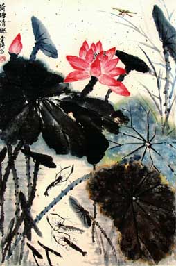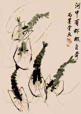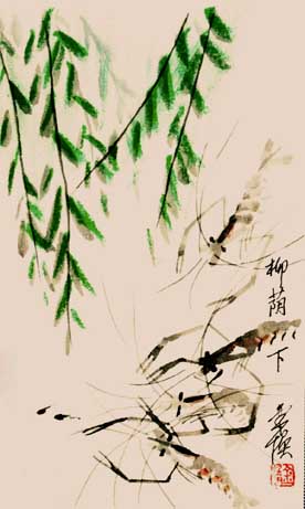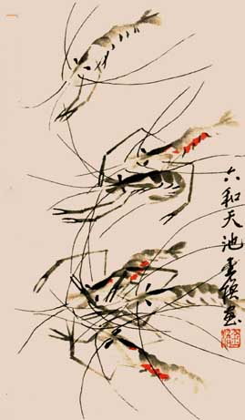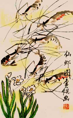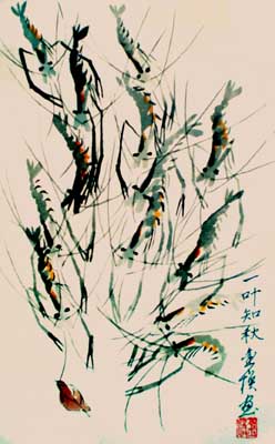 年近7旬的侯金焕先生,浙江诸暨人,少时即操笔弄翰,长达60年。他的“虾”图,动静各异、疏密有致。虾与虾有聚有散、布局合理,用笔洗炼而准确,遒劲而流畅,工写结合,透明水灵。在造型上,他吸取了西方绘画透视、解剖原理,着力体现虾的质感,重视水墨浓淡深浅,使整幅作品的和谐气氛得到渲染。他笔下的虾,条条活蹦乱跳,栩栩如生,达到了神似的艺术效果。为了画好虾,他不但临摹齐白石的虾和花鸟虫鱼,而且从市场上买来活虾长期观察写生,故他画的虾还能辨出雌雄来。他的一篇题为《从自然到创作“虾”》的论文在国际交流评选活动中荣获特等奖,被收录在《中华名人文论大全》一书中。