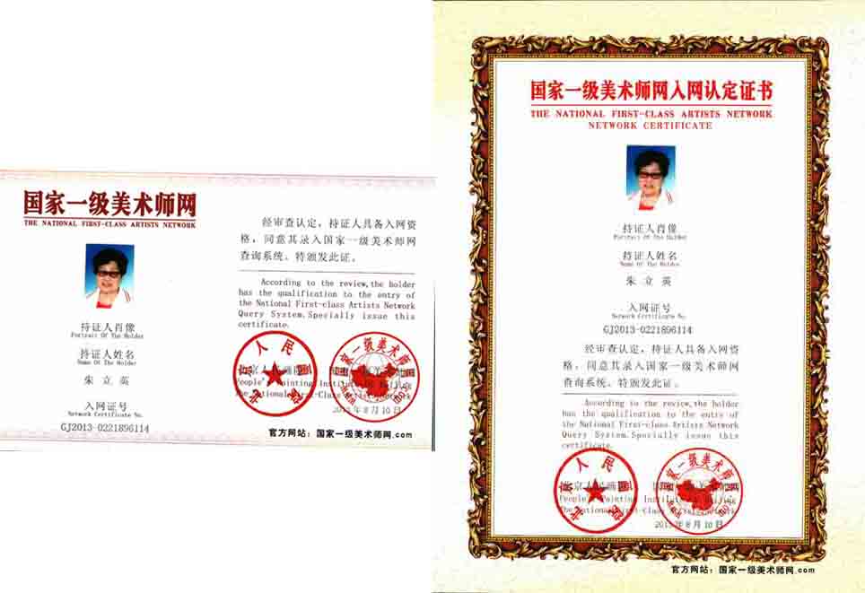 2010年9月由国际知名文艺家联合会、北京人民画院、中国名家书画院、中国文艺协会、中国优秀技术人才交流协会共同编辑出版的大型典籍《国际知名文艺家大辞典》,特专函向我邀稿,我的两副国画作品被选入编大型典籍《国际知名文艺家大辞典》,同时授予我“国际知名文艺家”荣誉称号,并赠我“二龙戏珠大玉玺”刻有“国际知名文艺家朱立英印”印章一枚。