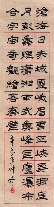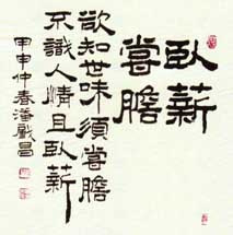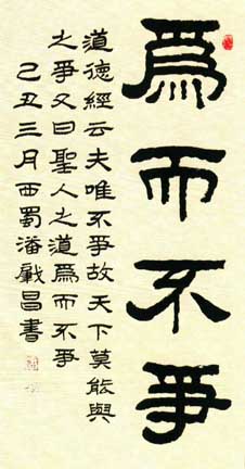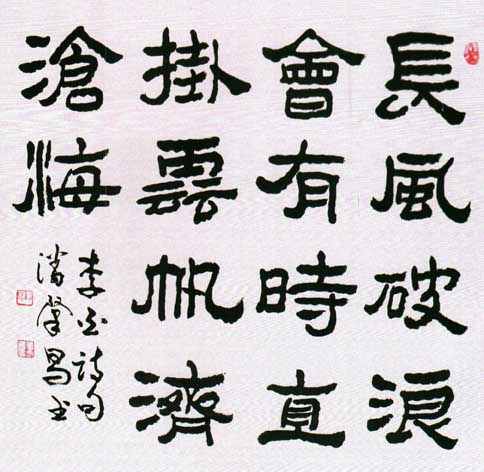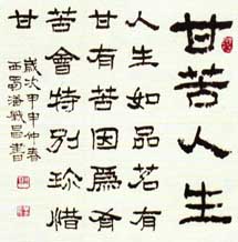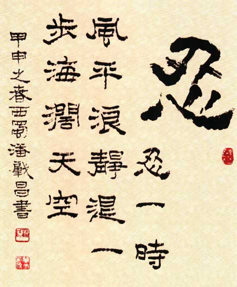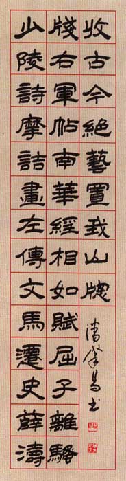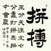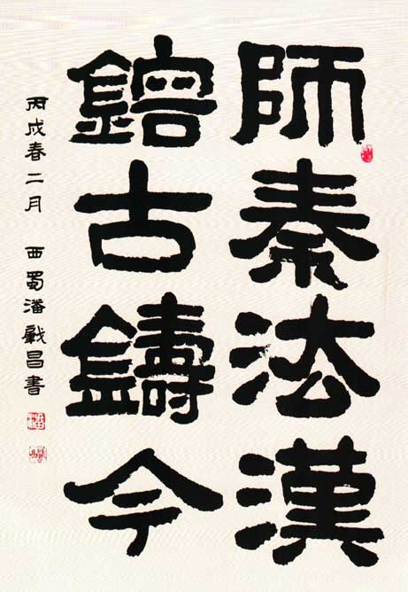 潘肇昌(1946—)别号中立山人,四川绵阳人,96届中国书协培训中心研修班结业。书艺入手于汉隶多重名牌。对汉、清两代隶书深入研究,创造了自成风貌的《潘肇昌录书(简称潘隶)》。书作师古不泥、雄健俊美、刚柔相济。近年对隶书章法多有创新,深得海内外藏家抬爱。