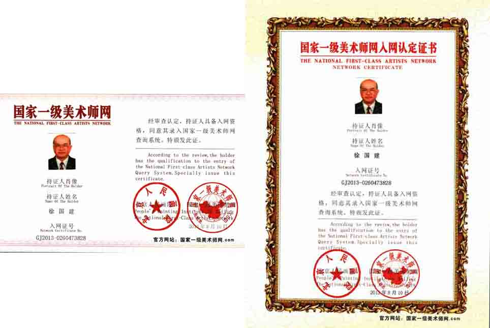 徐国建,字晨舜,男,汉族,1945年生,中国书画印研究院常务理事,中国国际书画艺术研究会会员,中国剑光书画院一级书画师,香港中华艺术家协会名誉会长。书画作品参加全国大赛多次获奖。新世纪之春成立《山水名堂》画廊。2002年其作品在香港信德中心展销市场展示、交流、买卖供海内外收藏。