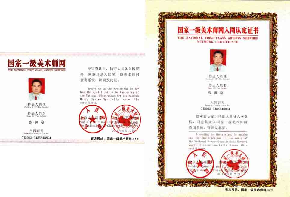 又获中国艺术交流协会颁发的纪念建党90周年杰出成就金奖。并授予“杰出艺术大师”称号。个人履历及作品纳入中国国家人才网——专业人才库。并获国家专业人才职业资格认定委员会认定的高级文学师资格证书。成为中国书画网签约书画家。并当选中国艺术学会“2011年感动中国艺术人物”和“2012年中国艺术•时代人物年度最高荣誉”荣誉称号,同时由中国国际画院聘为副院长及中国国际艺术家并入围中国知名艺术家数据库。2013年1月本人两幅作品在美国纽约展示被组委会评为金奖。2013年2月被新华艺术网艺委会任命为新华艺术网艺委会执行付主编。并安排4-8月份赴韩国进行文化考察访问。