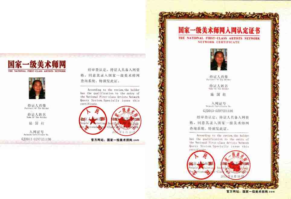 2011年10月13日,国际ISQ9000A书画艺术家资格认证中心,中国书法美术家艺术创作中心,中国书画艺术名家联合会,中国书画陆军联合授予:2011年度中国十大杰出书画家荣誉称号。2011年11月,人民书画院,中国国际书画院,中国书画名人研究会,中华书画杂志社联合授予:影响中国的十大艺术新闻人物荣誉证书。同时获:全国十强书法家荣誉称号。中国书画学会,中国文化传媒研究会,授予:世界华人艺术领袖荣誉称号。2010年10月11——13号全国艺术名家题贺展,书法作品“龙”获金奖。于世博会展出。颁发收藏证书。2004年2月5日第二春健康长寿陆国柱书画展在江苏省张家港市展出。2011年8月27——28日,陆国柱龙文化书法展在上海市崇明县图书馆展出。2011年12月31日作品参予浙江义乌市“大中华全国书画名家展”并聘为顾问。2012年1月5日——6日,赏心乐事——陆国柱书法专场在上海图书馆予展。由凤凰——满德嘉公司承办,江苏凤凰拍卖有限公司拍卖获圆满成功。