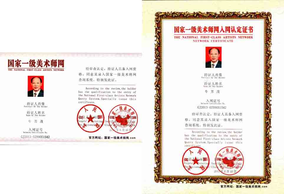牛芳茂,金铭轩主人。中国民族艺术家协会终身名誉主席、中国书画学会副主席、中国书画艺术协会副主席、中国书法艺术协会常务副主席、中国文化艺术协会副会长、北京市宝金轩书画院院长、中国楹联学会会员、中国三峡画院一级书法家、中国艺术品投资交易市场上市书画家、一得阁艺术馆特聘书法家。