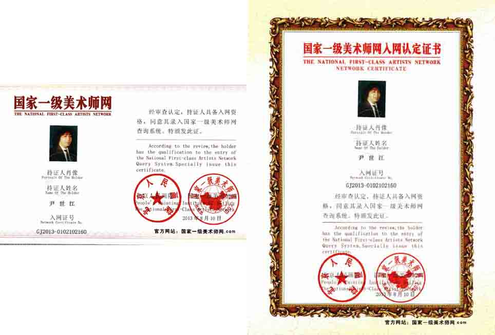 尹世江,男,1956年出生于天津。号龙道人,书名世家。被授予2006年度中美文化魅力人物最佳美术作品奖、中国书画学会首席艺术家、“文艺百年传世人物”、“中国民族文艺奠基人”、“中国书画导师”、“一代宗师”、“人类灵魂艺术家”、“共和国1949~2009文化艺术最高荣誉奖金奖”、“中国书画金奖艺术家”、“建国60周年中国文学艺术最高成就奖金奖”、“共和国杰出功勋文化艺术家”、“中国书画艺术最高奖项——金菊奖金奖”、“世界华人杰出贡献金奖艺术家”、“世界当代八大文化圣贤”终身成就奖、“世界文化艺术五星级艺术家”,“世界华人艺术领袖”、“金牌权威专家”,中国(国际)艺术品品牌资质认证委员会审核认证艺术作品核定为“中国艺术品顶级品牌”。作品入编《世界艺术通史》封面、《世界人物辞海》、《世界华人艺术领袖》封面、封底、《中国传世名作收藏与鉴赏》、《中国书画学会年鉴》封面、封底、《国家名人档案》封面、《中国国学专家人才库》、《新中国国礼艺术大师》、《当代中国书画家金奖作品集》(名誉编委)、《中国著名书画大师精品珍邮集》、《人民艺术功臣》封面、封底、《中华英才》封面、《榜样中国》封面、《文艺百年传世人物》封面、封底、《百年中国》、《国学艺术大典藏》、《共和国文艺典藏》、《共和国名人大典》、《中国文艺界名人库》、《共和国艺术功勋人物大辞典》封面、《共和国史记·艺术家列传》封面编委、《世界艺术巨匠》、《世界当代圣贤录》、《世界华人美术名家大典》、《世界人类非物质文化遗产传承人目录》、《世界文化艺术经典》、《世界优秀专家人才名典》、《世界艺术百科全书·中国人物卷》等,并被“今晚报”“天津日报”等多家书画报、网络媒体报道。
