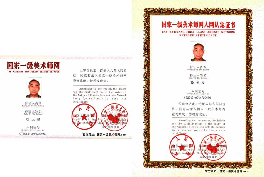 徐天禄,四川成都人,1940年6月9日生,中国国家书画院副院长,联合国国际文化艺术家联合会“总会理事”中华国际书画院院士,台北故宫书画院荣获院长,现代书画院和中国东方书画院名誉院长、二次综合评定授予“百杰功勋艺术家”荣誉称号,并荣获终身成就奖任中国诗书画学会,中国传统文化交流协会评定授予“金玉杯”全国诗书画“大师成就奖”金奖,2012年文化人物杂志社感动中国文化人物评选委员会授予“感动中国杰出文化传承人”荣誉称号,作品多次参加国内外书画大赛并多次获奖,奖项有金奖数次,特别金奖一次,授聘兼职有名誉院长,副院长、顾问、客事教授等职,作品在国内外被多家刊物及单位发表,其作品在国内外也有所收藏。