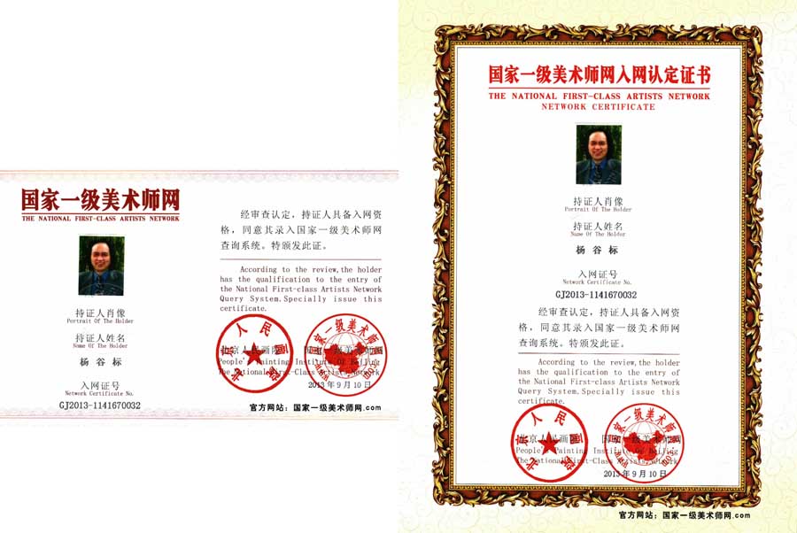 杨谷标,笔名石谷号一方半斋主,中国美术家协会会员、中国国画家协会理事、国家一级美术师、北京书画院客座教授、江苏省国画院特聘画师、中国书画研究院院务委员、高级美术师、中国艺联主席团副主席、中国名家书画院名誉院长、中国书画协会副主席、中国民族文艺家协会艺术发展部副部长等。80年代深造于中国美术学院国画系,研习潘天寿、诸乐三等大师画风。师从名家朱颖人、叶尚青教授门下,擅长写意花鸟画,代表作“荷塘初雪图”、“花魂”已编入《杭州美术50周年》大型美术史册。“舞雪图”获全国“新联杯”美术大赛金奖,广获好评。并被北京画院收藏,“涌情”获日中“人与自然”美术大赛优秀奖。“觅新”获全国六大古都美展优秀杰作奖。“故乡明月”、“万岩山中攀凌霄”、“梅韵”分别参加省首届、历届花鸟画展及百梅画展。“梅花鸲鹆图”入编《当代书画家鉴赏》一书。2000年3月浙江电视台播出题为“访著名花鸟画家杨谷标先生”专题片。同时浙江日报、美术报等分别发表了题为“辛勤觅花魂”、“杨谷标花鸟画的创新”等文章。