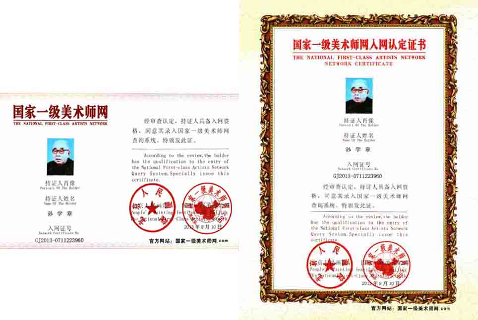 国家一级书画师,世界书画艺术家研究会副主席,2012年12月北京园艺粹宝书画院鉴于您近年来艺术创作方面取得的杰出成就和展现高尚的艺术品德及艺术水准,经研究决定,特聘您担任园艺粹宝书画院名誉院长。亚洲书画家联合会会员,(国际)中国书法家协会会员,国际美术家联合会会员;中国文化艺术城高级书画师兼艺术委员会理事,中国艺术网理事会荣誉理事长,中国艺术研究院会员,2009年3月中国国学研究会特聘孙学章同志研究员职务,中国艺术国际交流中心及世界华人文化研究中心资质评审委员会审定为一级书画师。