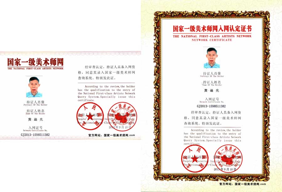 黄迪光,男,1949年生,广西人,壮族,大专学历。原广西南宁地区经委办公室主任,现为北京翰墨名人国际书画院士高级书画师,中国名人书法家协会会员、北京墨都书画院院委常务院士理事,中国书画名家研究会副理事长,中国国家书画院副院长,作品在全国性书画赛展中多次获奖,曾获“奥运杯”、“金色年华”、“红色之旅”、“红色经典”、“星火燎原”、“羲之艺术”、“博爱之都”、“慈善中国”、“爱在水墨”、“铭记英雄”、“记录感动”、“魅力夕阳”、“2008相约北京”、“书圣杯”、“黄山杯”、“北京奥运全国中老年书画家收藏拍卖”、“骄傲中国华夏书画名家作品典藏”等大赛金奖,“母亲颂”第十二届银奖,“东方杯”、“华夏情”一等奖。中国中老年书画名家上海世博国际交流展金奖,作品入编《二十一世纪中华翰墨名家大典》、《中国当代名家书画大观》、《世界大百科全书·文艺卷》等多部书画典籍,其中5幅作品被中国邮政发明信片。先后被授予“2007年优秀书画家”、“中国书画艺术大师”、“2008中国杰出奥运艺术家”、“2008年中国百杰书法家”、“中国文化艺术突出贡献人物”、“中国书画非物质文化遗产功勋人物”、“2010上海世博艺术名家”、“2010’、2011’感动中国艺术人物”、“全球华人最具有影响力的艺术家”、“世界文艺大师”等荣誉称号。2011年书法作品润格:8000-18000元/平方尺,3000美元/平方尺。