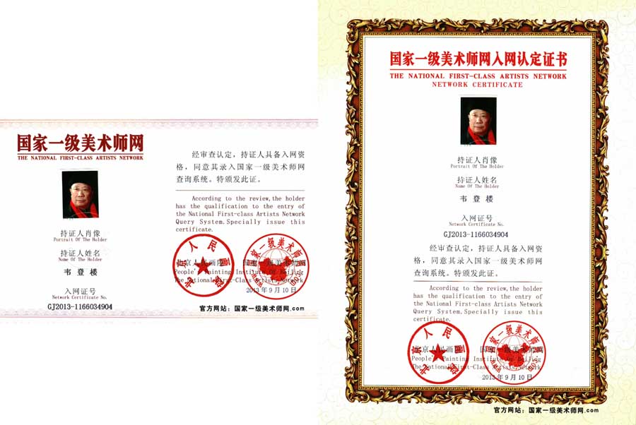 韦登楼,男,1937年7月生,汉,江苏江都人氏,中共党员,毕业于上海大学美术学院,宣传美工大专一级美术师。现为中国五体书法研究会隶书,专业委员会常务委员研究会副会长,中国书画家协会副会长中国书画家协会理事,上海市书法家协会会员等。历年来参加全国书展获金、银、铜多个。入编各级典籍160余本,2010年度参与法国巴黎中国传统文化艺术展交流活动,其书画在艺术上具有代表性对中国传统艺术做出一定贡献并富有创新的艺术家其书法作品在此次欧洲展中被评为“金奖”及榜样中国,中国知名艺术家荣誉称号,欧洲时报艺术中心授予其“中法艺术交流名人”荣誉称号。其隶书镌刻于安徽、河南、山东等碑林泰斗碑廊及山东潍坊中华艺术城大门口显要位置早已名扬海内外其书艺推陈出新功神兼备形成了自己的独特之风格被业内专家肯定深受业内外公众之赞扬,在汶川芦山地震中不顾年老体弱赶写10多幅书作参加《美术报》芦山平安岁月静好丹青接力校园书画作品捐赠活动受到好评。