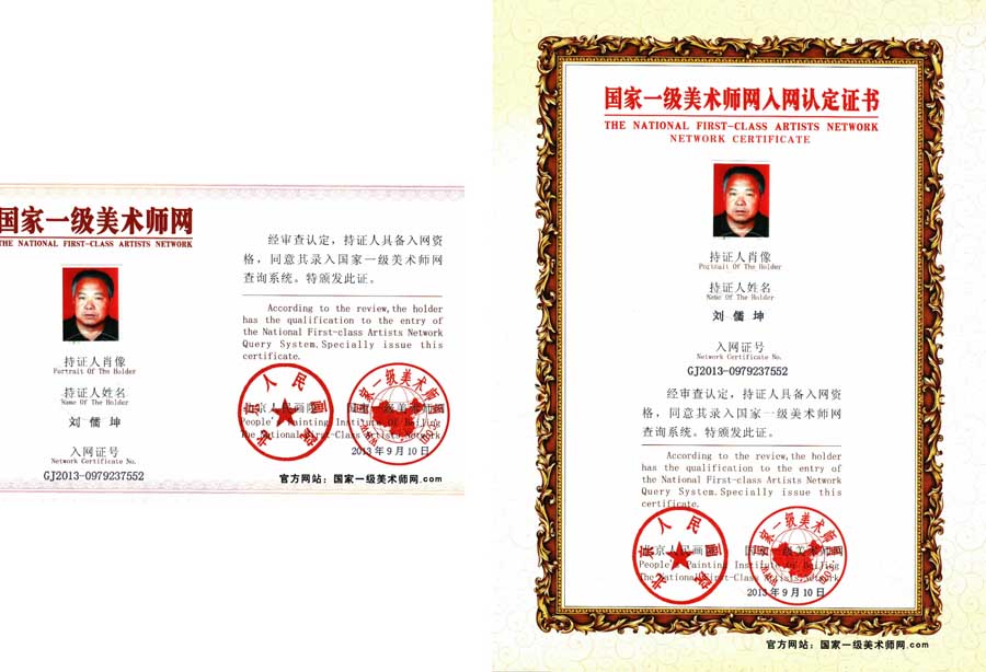 2001年经国际美术家联合会通过两项认证:ISQ9000A资质认证和ISC2000价值评定;中国艺术国际交流中心和世界华人文化研究中心专家组评定为特级书画师。一九九九年九年中国文学艺术界联合会命名“海峡两岸德艺双馨艺术家”称号。