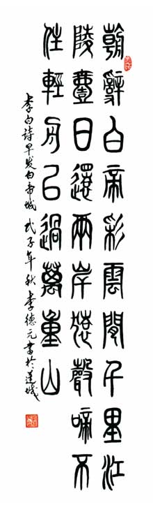 李德元,1948年9月出生于广东江门台山市,斋号二德堂,退休前是广东江门市人大驻会常委,江门市人民政府教育督学顾问,现是中国书法家协会、中国名人书法家协会和中华书画艺术家协会理事,中国毛泽东诗词书画艺术国际研究院艺术家学会名誉副主席,联合国教科文组织专家委员会专家委员,香港珠江书画院副院长,北京宝延轩书画院院士,北京九州枫林国际书画院常务院士,数十年对中国文化的景仰追寻,苦心探索,临池不懈,笔耕不辍,集众家之长,形成鲜明的个人艺术风格,擅篆、行、草各种书体,风格古朴而又新颖。