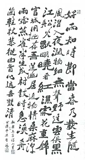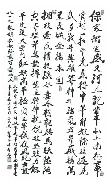 史智斌,男,生于一九五四年,祖籍泾川阑家山人,自幼受祖父的熏陶爱好书法,上小学时,在杨绍亭老师的启发下,从师柳公权、颜正卿的碑帖门下,苦苦追求,苦练二十多年,发现了扬州八怪之一郑板桥的六分半书,查资料买碑帖,慢慢探索,一九九二年湖北桂竹杯书画大赛获得二等奖,二○○二年在青岛崂山兰亭杯中获得优秀奖,通过书法交流找到了板桥书法大师郑燮第十一代传人何仰羲老先生的碑帖,研究探索终于走上了正道。二○一○年在中国诗书画印四绝大赛中获得书法一等奖,在唐诗宋词世界华人书画大赛中获得书法特等奖,在二○一一年庆祝建党九十周年全国书画大赛中获得书法金奖。书法大家的评论、点评认为史智斌先生的板桥字如笔走龙蛇、笔风墨雨、疏密交织、会贯一通、大小分布、错落有致、疑重灵动、字体豪放、气势磅礴、如千年古松,似墨海游龙,让人看了爱不释手,有当今板桥再世之风范。现为平凉市文化产业协会副会长,崆峒书画院院长,甘肃省协会员,让板桥字供人欣赏,再发奇光。