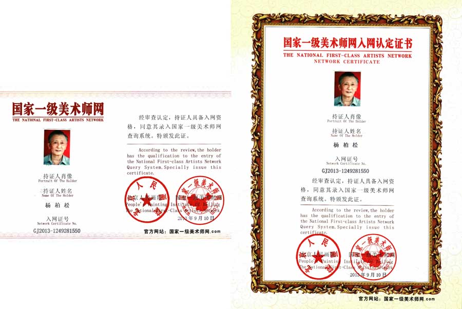 杨柏松,1933年出生,广东省河源市龙川县佗城镇人。中学高级教师,毕业于华南师大中文系,历任教师、校长等职,为培养下一代,付出了自己的心血。曾兼任北京师院函授部设在广东水电三局大专中文函授站辅导员。1987年迁居东莞市塘厦镇。退休后,学习书画,1999年毕业于中国书画函授大学上海分校中国画专业。绘画作品曾多次获得过全国等级奖或优秀奖,部分作品入编多部书画典籍。先后被授予“二十世纪百家书画家”、“中国书画艺术界杰出贡献奖”、“AAA级中国国际金奖艺术家”、“当代书画艺术名人”等荣誉称号。2006年被评为国家一级美术师。现为中国书画家协会会员,中国文人美术家协会会员、中国国画院院士、国际羲之书画院名誉院长、东莞市书法家协会塘厦分会会员。2008年4月,参加“纪念中国改革开放三十周年全国中老年书画作品北京邀请展”获金奖。10月,参加状元杯国际书画大奖赛,获状元奖。2009年,参加“在盛世中华情——全国书画名家邀请展”中,荣获金奖。8月和2010年5月,先后被中国艺术家交流协会、中国当代艺术协会聘为终身名誉主席,2010年参加“翰墨丹青迎世博”全国老年书画艺术邀请赛中,荣获金奖。12月,被国际知名文艺家联合会等单位,评为“国际知名文艺家”荣誉称号。2011年,在“纪念辛亥革命100周年暨庆祝建党90周年全国邀请展”中,被评为金奖,同时被授予“杰出功勋书画家”荣誉称号。个人简历,入编多部辞书。