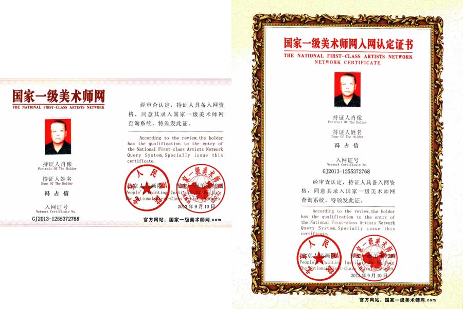 冯占信,男,字德民,号武墨,1945年6月生,山东省青州市东朱良人。自幼喜爱书法艺术,于1994年9月至1996年9月中国书协书培中心第二届高级书法班结业。其间受沈鹏·王景芬·张旭光·李松等多位名家教授亲点面授受益匪浅,自此一发而不可收,笔耕不辍至今。本人现为国家一级美术师,中国工艺美术家协会副主席,中国书画家协会理事,中国文学艺术工作者联合会会员,中国书法艺术协会,世界华人书画名家协会终身会员,受聘于中国文化艺术城艺委会理事,中国艺术网荣誉副主席,王铎书画院名誉院长。英格兰皇家艺术基金会终身艺术顾问等职,本人作品在国内外展赛活动中获奖计近百项次。其中特金奖2项,金奖(包括一等奖)7项,银奖(包括二等奖)10项,铜奖(包括三等奖)11项,优秀及其它奖项不计。其作品曾展出于日、新、韩、美缅、台等国家和地区及国内各大中城市文传单位,作品及艺术简历被载入中国文学艺术作品博览,山东书画家中国当代书法家选集等大型典集50余部,曾先后由政府及文化机构授予:国家一级书画师、中国当代实力派书画家、爱心助残艺术家、爱国艺术家、德艺双馨艺术家、人民优秀艺术家等荣誉称号。多家网站、报纸、电视台对其业迹做过报道。
