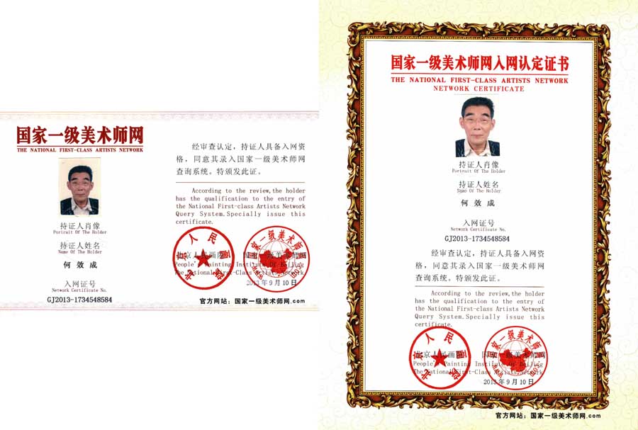 何效成,一九三九年生,名平字效成,笔名人可,号黄河闲人,江苏东台人,退休教师。酷爱书画艺术,敏悟好学。退休后,时间充裕,终以法帖、图集、资料为师:“四宝”为友,潜心临摹三年。致力于对楷、行、隶、草书及工笔花鸟画的专研和探导颇具成效。二○○二年以来,其书画作品在国际、国内大展赛中曾多次获奖、入展、入编和收藏。在小精品中国书画创作大赛中,狂草书法作品获银奖,在中韩书画家作品大展赛中,楷书作品获金奖,纪念颜真卿大师诞辰1295周年国际名家交流展中,工笔画《丹凤朝阳》获一等奖,工笔画《喜上梅梢》获亚欧怀国际金奖等数十次,部分作品在马来西亚、新加坡、美国、巴西、韩国、日本等国家展出。书画作品入编《中国书画名家作品集》、《中国书法家作品集》、《中华书法大师》、《中国书法鉴赏大典》、《国际书画名家精品集》、《强国丰碑》、《艺术中国》、《中国书法全集》;传略收录在《世界优秀人才名典》、《世界人物辞海》、《世界名人录》等四十多部典集。现为乔木故里书画协会书法博士高级画师,东方艺术院终身客座教授,中国翰墨书画院院士;中国书法家协会会员,中国美术家协会会员,中国书画学会副主席,国际工笔重彩画研究会名誉会长,宋庄国际书画院终身院长等。