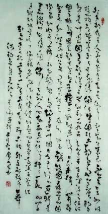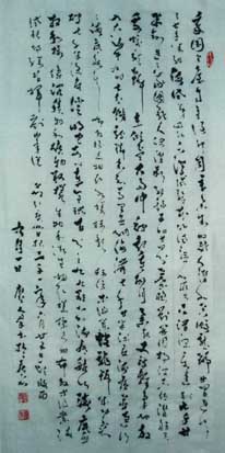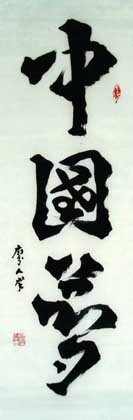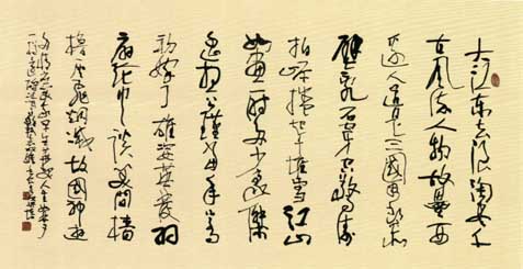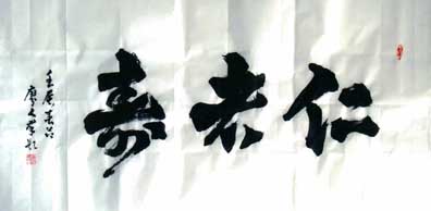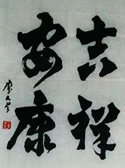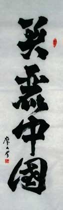 人群大字,以方笔入草为“方草大字”。其方笔融入北魏但不照版魏碑,变取唐欧柳点竖撇,方圆兼用又别于清赵之谦,自领风格。其方草大字厚重遒劲,势态活灵,雄浑正大,可谓“大方草正”:大,乃恢弘大气,展我国运气势恢弘。方,显闯创张扬,示我中华民族伟大复兴之坚毅。草,喻潦乱旧袭,为改革开放迎换新天。正,且鲜活凛然,昭我文明堂正,民主自由,国强不可侵犯。