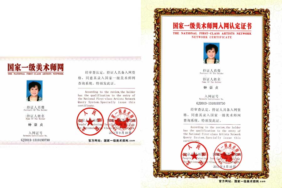 钟崇贞,女,生于广东客家,大专文化,是世界艺术家协会会员,世界华人杰出艺术家荣誉称号,中国艺术学会终身常务委员。中国艺术交流协会终身“名誉主席”。担任联合国艺术家收藏家联合副会长。中国民族艺术家协会终身常务副会长,国家美术院副院长,聘为国家中华艺术家学会高级荣誉顾问,北京人民画院院士。中国书画创作中心荣誉教授。王铎故里书画院、国际羲之书画院名誉院长、曾多次参加全国及海内外书画大赛中获特别奖、金银奖、一等奖、二等奖一百多次。