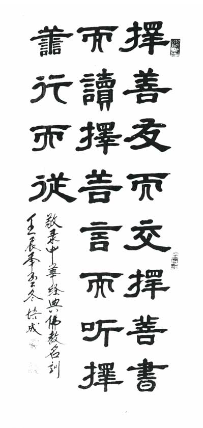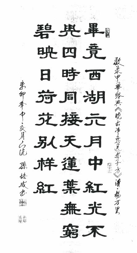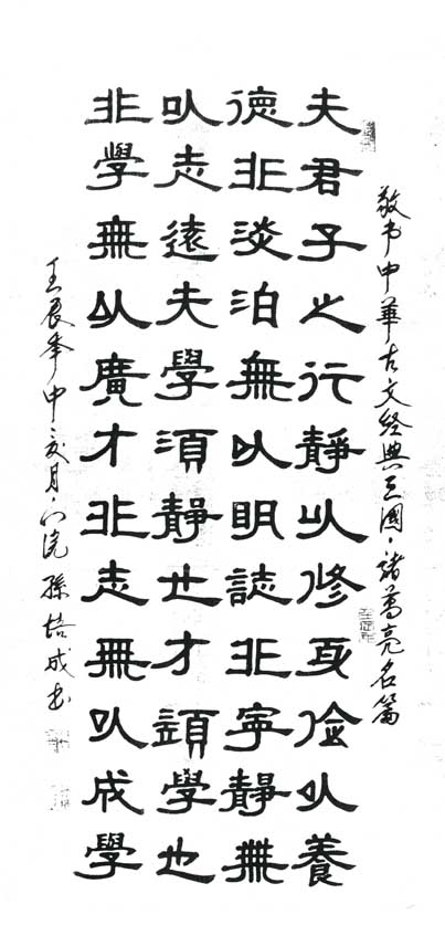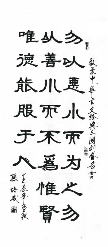 孙培成,男,汉族,现年69岁。自然热爱书法,几十年来,长期坚持学习,取得卓著成效。现任聊城市书法协会会员、台湾中国书法协会会员、中国书画家协会理事、香港中国书法家协会副主席、中国艺术家协会副会长。中国艺术鉴定学部委员会理事。中国书法家协会理事。中国国家书画院副院长。书法博士。近年来,参加国际国内书画大赛多次,荣获国际国内最高奖项108次,特等奖92次,金星奖,终身成就奖,旗舰金奖16次,金奖和一等奖66次,银奖、二等奖3次,优秀奖1次,作品分别编入书画艺术优秀作品集97期/次,编入中国书画家精品宝典81部。178期被各个藏馆、博物馆收藏家收藏。在国际国内联展中,先后参加了较大规模的国际性联展联赛17次,作品先后在日本、韩国、新加坡、马来西来一、美国、法国、泰国、德国展出,受到国际友人的好评和奖励。先后被授予中国书画艺术精英、中国当代书画大家,共和国杰出贡献书画家,国际最具影响力的书画名人,最具时代风采的艺术大师等荣誉称号。是近年来,中国在国际国内大赛中参展获奖最多的书画家也是全国荣获特等奖最多的书画家。在北京华夏夕阳红隆重纪念朱德总司令诞辰120周年暨庆祝中华人民共和国成立57周年书画精品大展中、在纪念邓小平南巡15周年全国书画大赛中,在纪念周恩来总理110周年诞辰书画大展中,在纪念中国改革开放30周年全国书画大赛中,在纪念孙中山先生诞辰140周年全国书画大展中,在纪念中国人民解放军建军80周年全国书画联展中,在庆祝香港回归10周年全国书画大庆大赛中,在纪念毛泽东诞辰114周年全国书画联展联赛中,在隆重庆祝党的十七大胜利召开全国书画大赛中,在喜迎奥运爱我中华等这些大型大书画联展联赛中先后获得特等奖、一等奖。在全国书画段位大赛中被评为全国最高等级九段位。在纪念中国共产党成立85周年书画联展大赛中,北京人民大会堂笔会被授予“爱国优秀书法家”荣誉称号;在国际书画艺术资格认证和全国书画艺术名家作品鉴定中,在华夏情全国书画润格大赛中,经中国艺术家鉴定学部委员会权威专家张仃、沈鹏、欧阳是石、刘大为、贺庆之、高占祥、范曾、刘勃舒、史树青等严格审定评定,作品润格价每平方尺人民币20000元(3216美元),并由中国书画家最高领导人沈鹏、刘大为、欧阳中石等亲函招聘为中国艺术鉴定委员会、学部委员会理事。