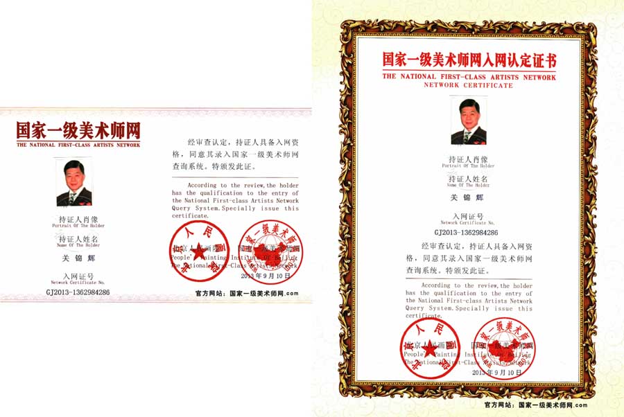 关锦辉(晖)(1948年出生)广东人,全国一级书画家、中国艺术家交流协会终身名誉主席、中国当代艺术协会终身名誉主席、中国艺术学会常务委员、中国名家研究会副理事长、北京奥林匹克书画院名誉院长、中国名家书画院名誉院长、中国书画收藏研究院名誉院等兼高级书画师、中国网教中心艺术部总顾问等。