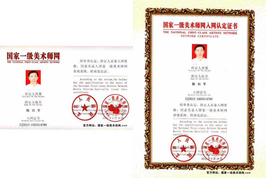 陈向军,男,1956年7月生。现为中国民间文艺家协会会员、中国国画家协会会员、中国艺术工作者协会名誉会长、燕京书画院名誉院长、广东省美术家协会会员、潮州市文化馆馆长、潮州市美术家协会副主席、潮州画院特聘画师。1998年被中国艺术研究院、文化市场人才中心评为二级美术家,同年被新加坡新神州艺术院特聘授予一级国画大师,2002年被南京徐悲鸿画院聘为书画家,1996年至2012年先后举办个人画展4次,联展5次。