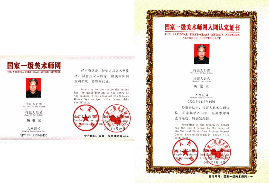 2005年由国际ISO9000A书画艺术家资格认证中心授予“中国百强书画家”称号,并任中心副主席,评审委员、终身教授之职,润格为每平方尺3000-5000元。