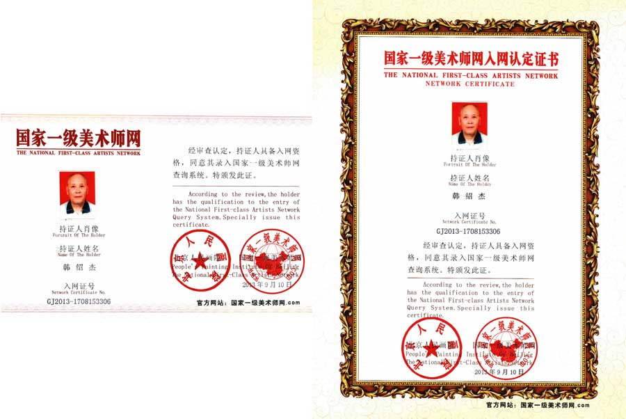 韩绍杰,男,汉族,生于1936年,大专学历,退休干部,1949年参加工作,1955年入党,1959年提干,历任车间主任,宣传教育科长,党委办主任等职。1989年退休,经济师,退休后从事书画研究,加入县、市、省、全国老年书画研究会为会员,参加本地,全国书画大赛百余次,入选获奖百余次,其中金、银、铜奖10余次,优秀奖10余次。作品入选中华魂、与时俱进写春秋、老干部书画集等。2008年评为国际杰出创作艺术家。2010年评为高级书画师和北京兰亭书画院名誉院长、终身书画师等。