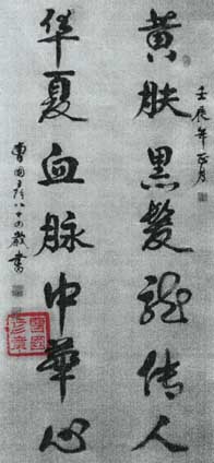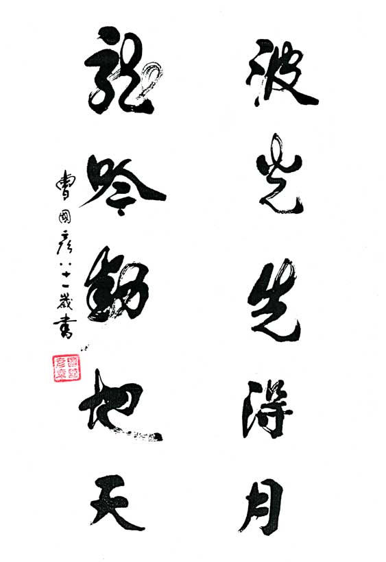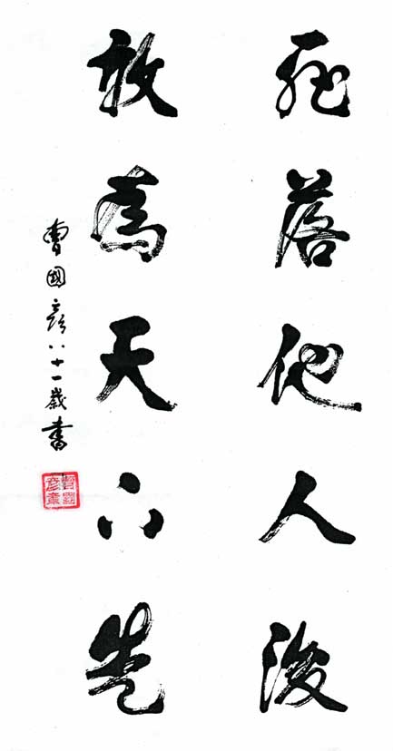 曹国彦,1928年出生,现年85岁,中共党员,退休干部著名书法家,农业经济师,擅行草行楷。世界教科文卫组织专家成员、艺委会执行委员、首席艺术家、中国国际书法家协会、中华书画家协会、中国中外名人文化研究会、中国老年书画家协会会员、中国当代艺术家协会、中国名家书画院、中国人文书画院等名誉院长、中国书法美术家艺术中心终身荣誉教授、世界杰出华人联合会付主席、中国书画学会付主席、当代文化艺术精神导师、国际德艺双馨艺术家、人民艺术功臣、世界华人艺术领袖、人类灵魂艺术家、人民楷模、世界华人文学艺术宗师、全国十强书法家、世界华人艺术大师、中国当代艺神、新中国书画八大家、中国国际艺术网艺术顾问、世界华人文艺先锋人物。中国传奇人物,中国诗书画联盟网名誉主席、中国诗词院名誉院长、中国当代艺苑名家、共和国红色传承功勋人物、红色文化形象大使。