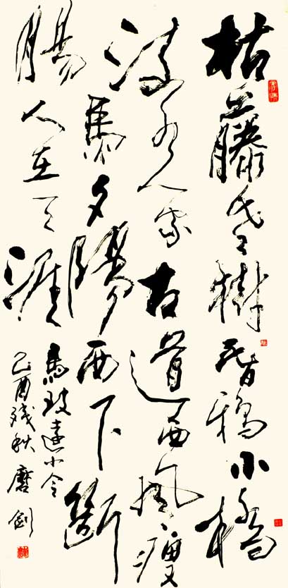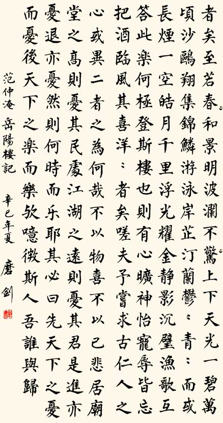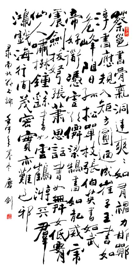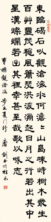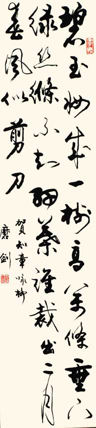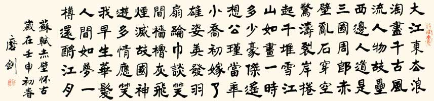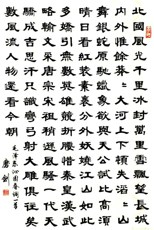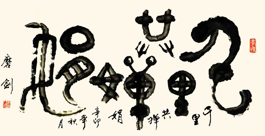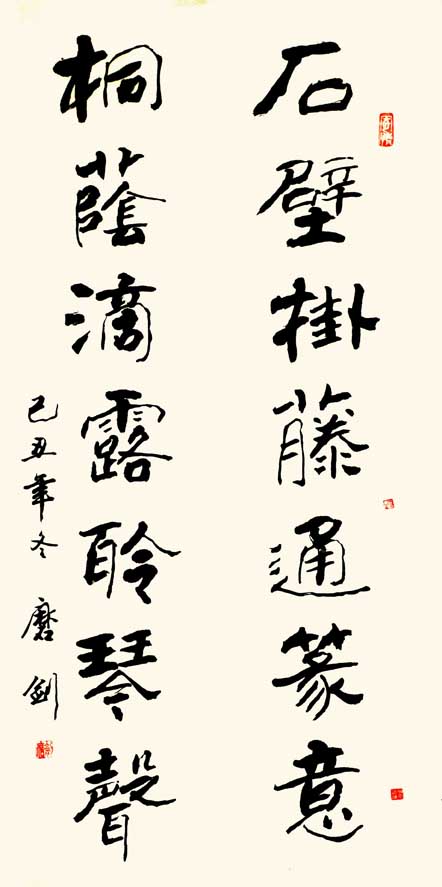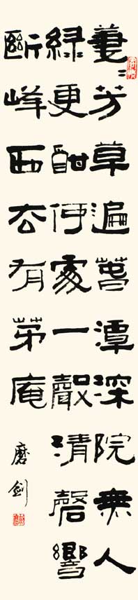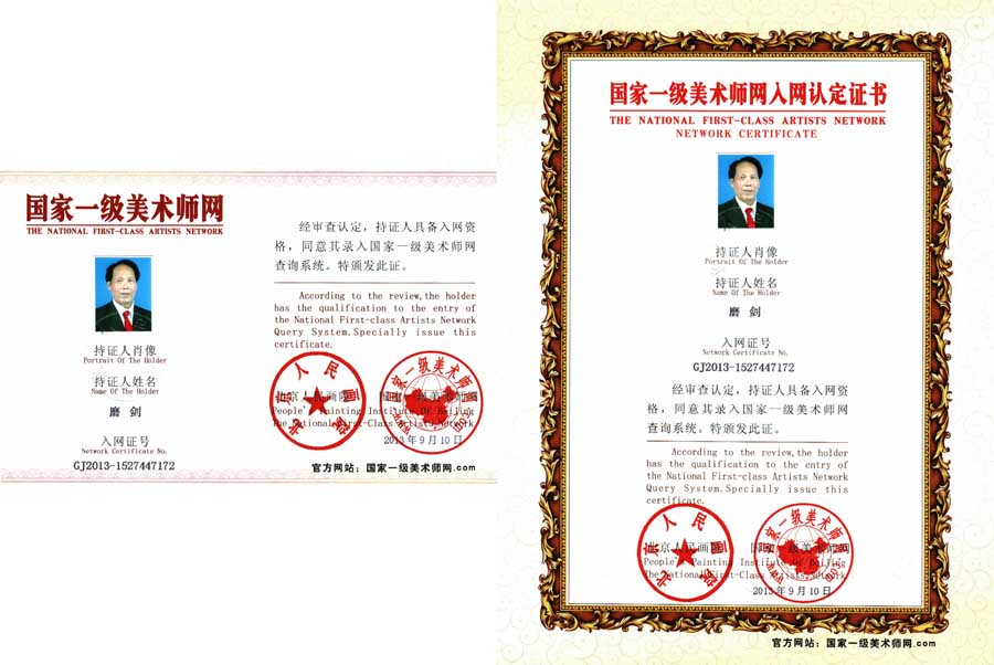 磨剑,男,壮族,1935年12月生,广西上林人。幼承家学,四岁临帖,后广习欧、柳、颜楷法、复摹汉隶名碑。作品曾获国家级展十三次金奖、六次银奖、五次铜奖、世界华人艺术展“国际银奖”、“国际文艺杰出贡献奖”、“首届中国名家红色经典艺术成就奖”、“特等奖”并授予“当代著名红色艺术家”及“国际文艺贡献人物”、“国学功勋艺术家”、“全球最具影响力艺术家”、“人民艺术大师”、世界书画艺术评价协会评为《当代最具有收藏价值书画百杰》,润格评定为3000元人民币/平方尺。作品曾被国家博物院及延安博物馆、一级书画师。作品及历照入编于《中国当代书法家大辞典》、《二十世纪中国著名书画家》、《中国历代著名书画家》、《亚洲艺坛名流》、《中华魂》等十多部典籍。