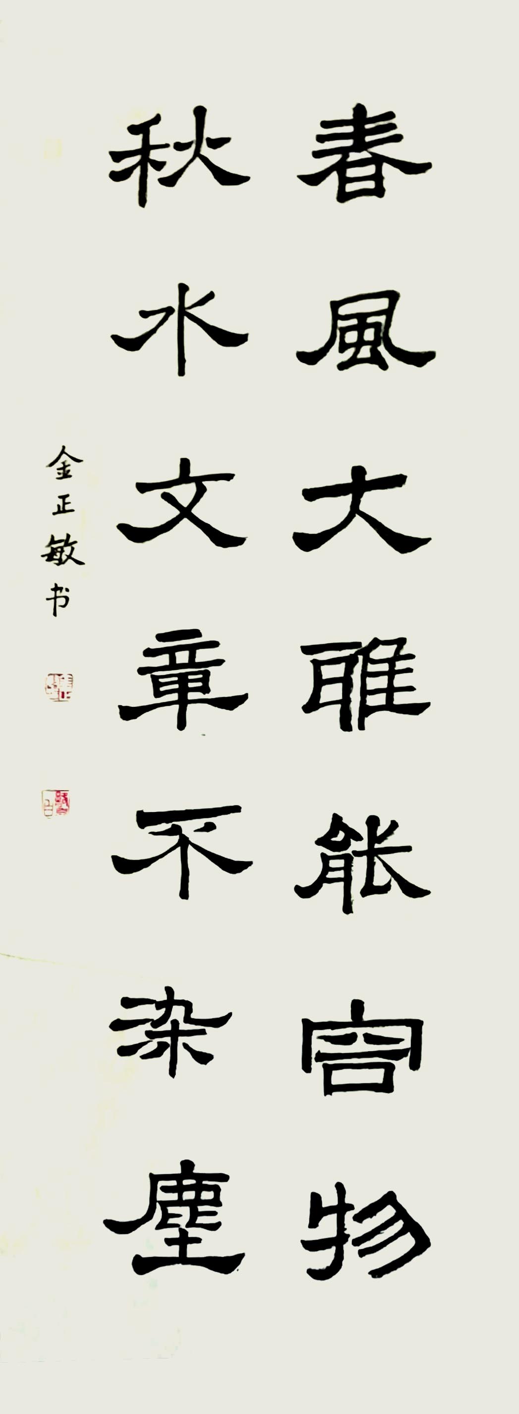 金正敏,出生在李白的第二故乡——安陆市。富有诗意的山山水水,无处不有的乡野风情、乐趣滋养了我十八年,呼吸着青山绿水所给予我的灵感,使我从小就爱好文学、音乐、舞蹈这些也奠定了我今生对书法艺术的挚爱,从小跟父亲学习书法,博采众家之所长,书法作品曾多次在国内外获奖。