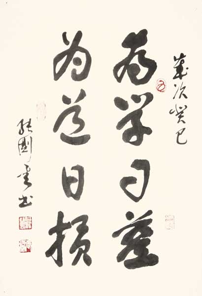 张先生幼年即描红习字,广涉各种书体,积学累功,谙熟中国书法要旨.其草书恬淡雍容,独具意趣,把个人深邃艺术涵养和丰厚之人生磨砺注入笔端,故其笔势恢宏,意态纵横,寄寓了人生的笃信力行和艺术遐思。张先生以为,学书之难,不在笔墨技巧而在人品颉颃,即学书法容易,字外功犹难,需要学养与品行并重,从而达到逸兴遄飞,心手双畅之艺术境界。