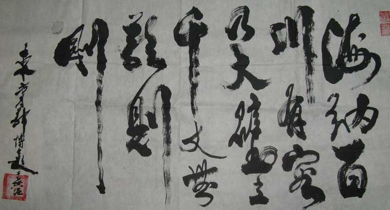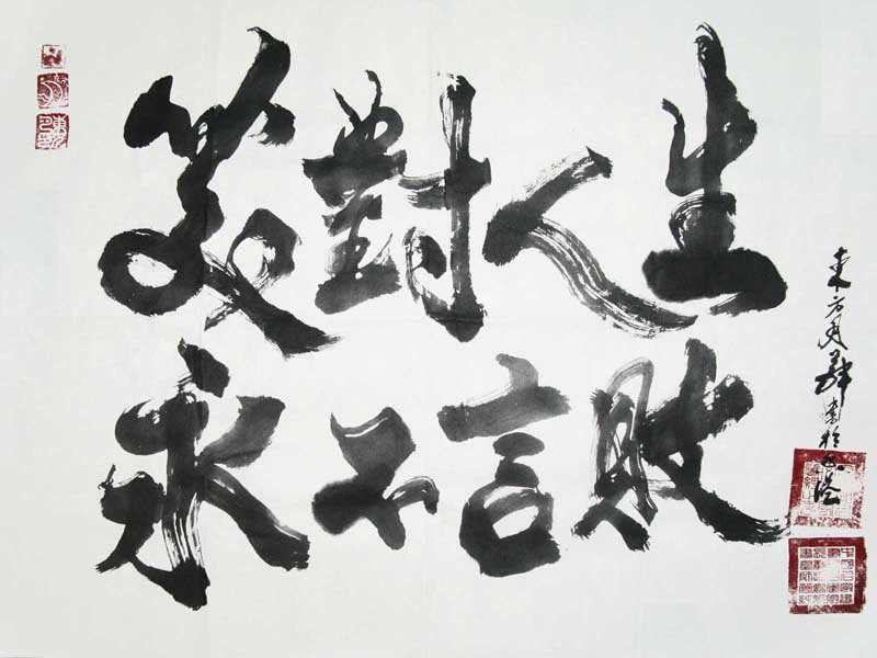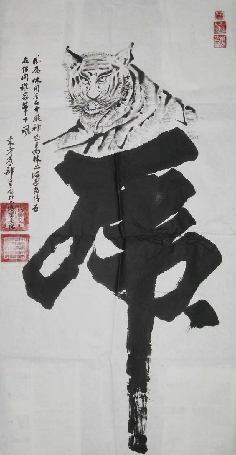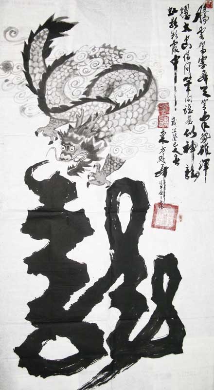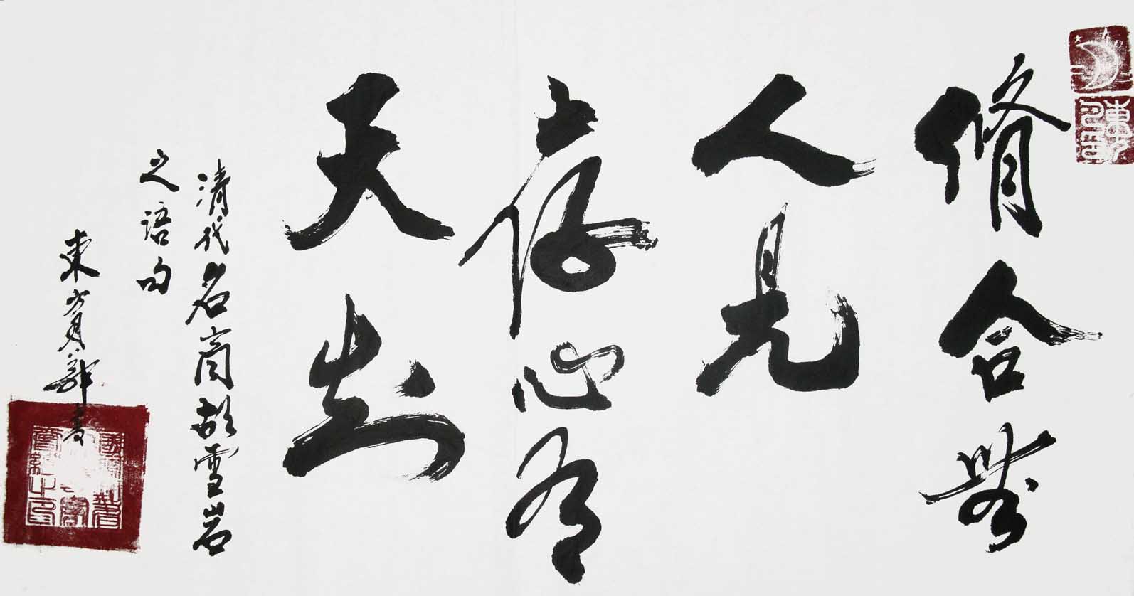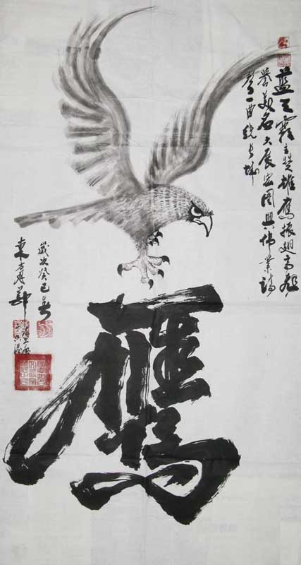 他是一位卓有成就的诗人作家和教育家,更是一位承前创新的中国书画家。他的诗文清新俊逸;他的书法典雅清新,劲遒潇洒;他的画,意势相融,耐人寻味。尤其是他把诗书画融合其中,有如天马行空般神捷,有如流水行云般抒情,有如电闪雷呜般苍劲,诗书画三绝,天人合一,令人陶醉和沉思。如他的《龙之赞》《鹰之赞》《福之思》《竹之颂》等作品都把诗书画融成一体,意味无穷,充分表达了中国书画艺术创新雄浑之气势!