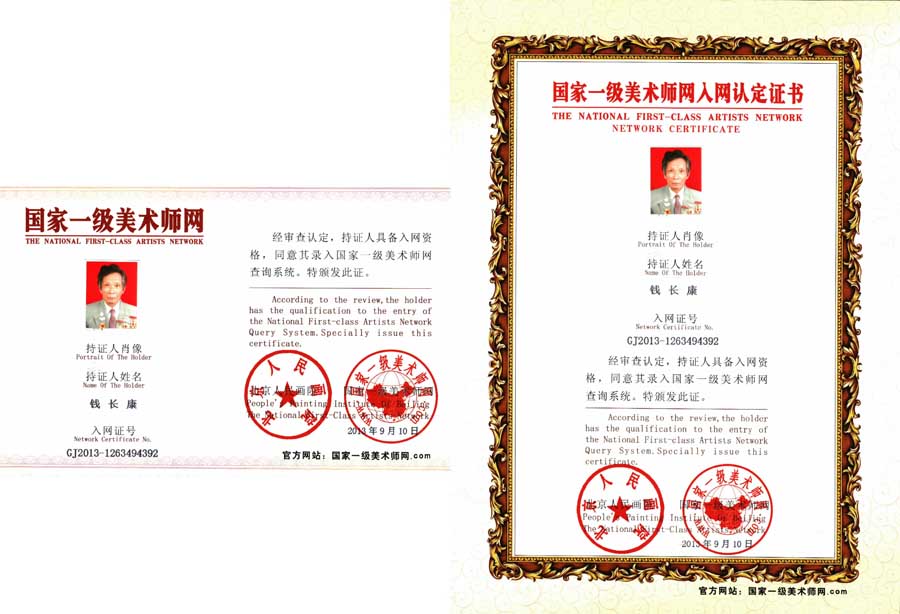 钱长康,国家级著名书法家,擅长狂草榜书。书法受著名书法家王冬龄、吕迈、姜东舒指导。现任浙江工业大学副研究员、中国管理科学研究院研究中心专家委员会首席专家、客座教授、世界教科文卫组织首席艺术家兼艺术委员会执行委员、中国国礼艺术大师协会特邀委员、中国书画学会副主席、中国书画名家研究会副会长、中国国学研究会名誉会长、联合国美术家协会会员、中国著名书画家协会理事、中国艺术鉴定委员会艺术家学部委员会理事委员等职。外交部推荐:书法作品作为国礼使用。论文《章法和论》荣获“世界重大学术创新成果特等奖”,解决了世界性相关学术难题,填补了本学术领域的相关空白,并入编《世界重大学术创新成果获奖精典》。中国文化艺术终身成就奖评定中心认定:书法艺术品为一级珍贵文艺作品。书法作品入编2008年上海世博会《中国荣誉——向世界推荐的国礼艺术家》16人集大型纪念画册。论文《三元全息书画原理试探》入编《国际杰出专家论著精粹》。狂草榜书《华夏瑰宝》刻碑于湖北鄂州莲花山碑林。多次参加国内外书画大展赛。荣获联合国“首届人类贡献奖文化艺术类书法金奖”、“世界文化艺术杰出贡献奖最高金奖”、“中国选区——首届文化艺术国际金球奖书法成果金奖”、“香港金色奖章”、“第三、第四、第五、第六届金鼎奖全国书法美术大展赛书法金奖”等特等奖、金奖50余个大奖及“AAA级中国国际金奖艺术家”、“中国人民杰出艺术家”、“世界艺术大师” 、“书画大师”、“最具市场收藏潜力书画家”等多个荣誉称号。业绩传略入选《新中国国礼艺术大师》、《世界艺术大师辞典》、《世界名人录》等210余部典籍。