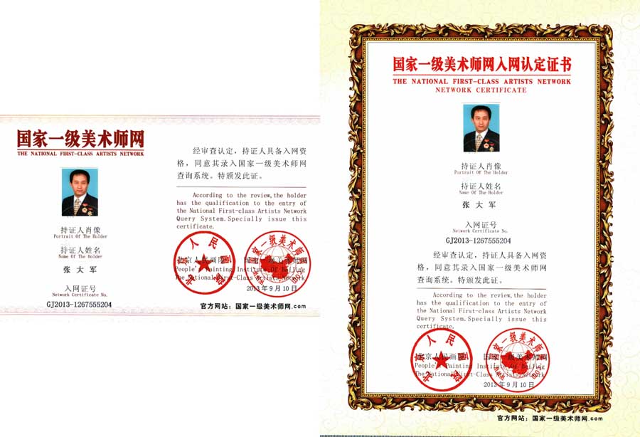 张大军,(字:字武;号:鲍东居士;斋:微云斋)山东济南人。现任,中国书画学会副主席,中国书画艺术家协会常务理事。2005年12月经过国际权威机构鉴定,颁发书画作品润格认定证书。编号:ISS9003-063。12月30日又经过ISQ9000A艺术体系,资质认证。授予:“当代中国书画市场最具收藏升值潜力艺术家”。2007年10月被世界管理科学研究院,聘为“国际专家”,证件:SJGL026。2008年1月1日,中国当代名家书画保真工程组织委员会,颁发润格证书,国际市场价:8600美元/每平方尺。2009年12月30日,经中国(国际)艺术品牌资质认证,核定为“中国艺术品顶级品牌”资质证书,国际通用证书编码:GJSMYP2010-1001。2010年12月12日,荣获“首届世界人类非物质文化遗产杰出成就奖”,并被授予:“世界人类非物质文化遗产杰出传承人”荣誉称号。2013年8月,国务院国宾礼特供推荐艺术家。艺术作品入编《中国当代实力派书画拍卖图鉴》A卷·B卷。《中华传世书画收藏大典》、《世界人物辞海》、《世界名人录》、《世界艺术大系—中国艺术》、《世界文学艺术家大辞典》(华人第一卷)、《中国当代书画名家润格辞典》、《中国书画学会年鉴》等各类杂志专著260多部。艺术作品曾多次参加国内外书画艺术大展,荣获“金奖”、“一等奖”、“特等奖”、“国际金奖”,其书法、篆刻、绘画、植根传统、师古不泥、融合碑帖,营造自我,以独特个性书风,闻名于当今书坛。