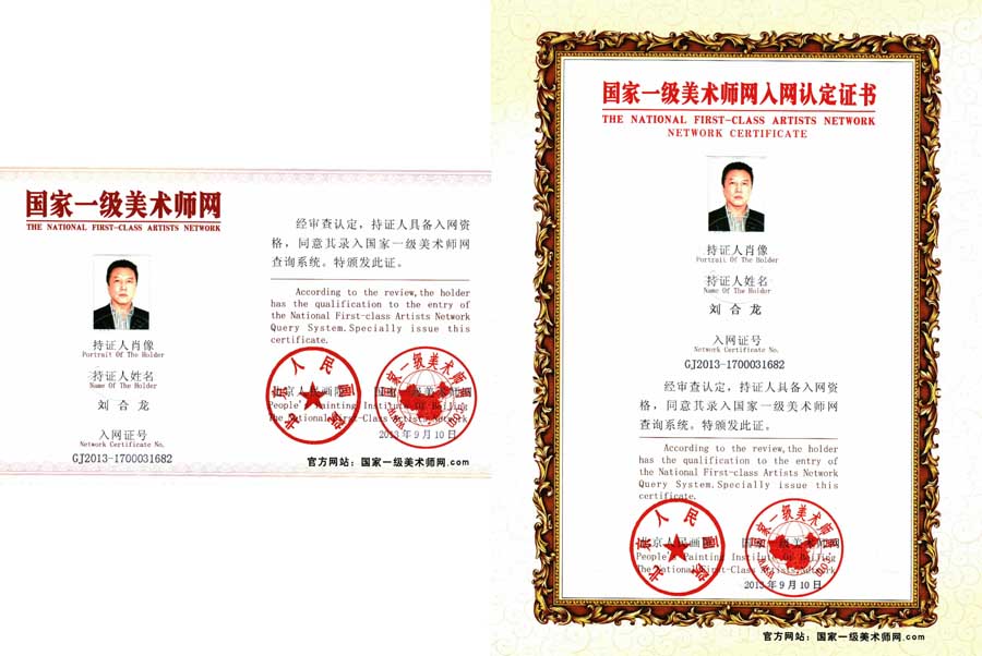 2012第三届全国诗书画印四绝大赛'金龙艺术奖.书法创作一等奖、中国国际文艺家协会博学会员和高级书画师