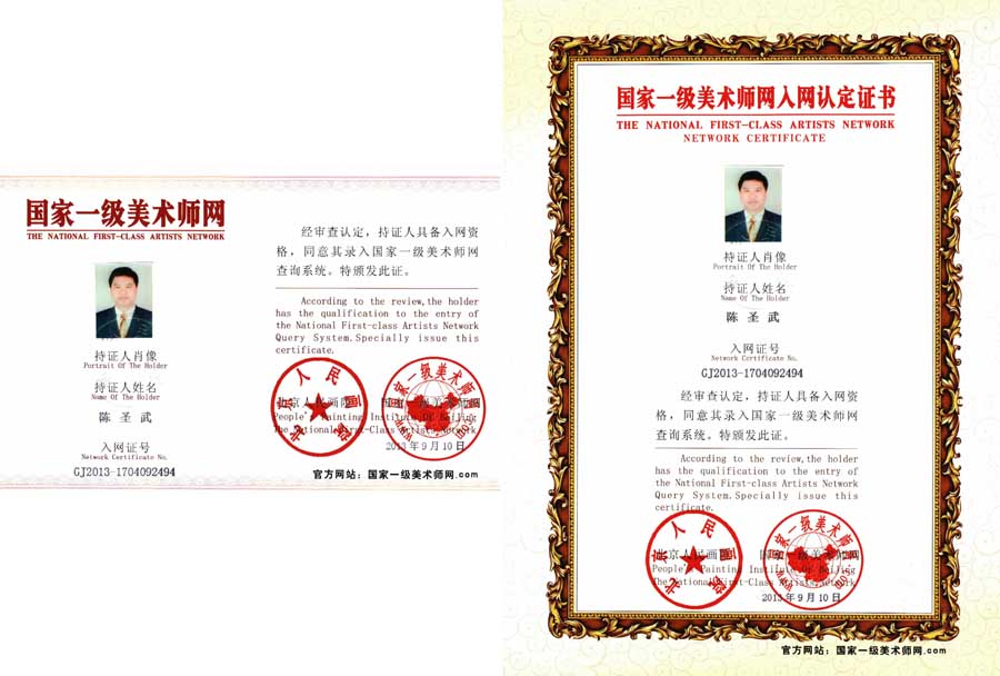 陈圣武,字斋,号圣悟,1959年生,浙江青田人。中国书画研究院研究员。1983年书法作品参加全国二届书法展览,并入编《全国第二届书法作品集》;1986年作品参加全国银牛书法大展获二等奖;2004年书法作品参加今日中国书法美术精品展并入编《今日中国书法美术精品集》;2004年书法国画作品获由《人民画报》和《中国文化信息协会》主办的书画美术作品展金奖。授予“中国书画艺术家百佳”称号;2007年书画入编《中国书画家》大典。2009年国画入编《中国书画家志》;2010年书法入编《中国当代诗书画印四绝大典》;2010年国画入编《中国书画展览年鉴》;2010年国画入编大型美术选本《新中国美术家选集》;2010年国画入编《中国国粹大典》;2010年书法入编《全国楹联书法绘画邀请展作品选》;2011年国画入编并特别授予《新中国独具艺术魅力的美术家》、《辛亥百年中国艺术选集》。2013年国画入编《当代华人艺术经典》;2013年与中国美协主席刘大为先生合作出版了《中国当代艺圣》;2013年出版了《国家艺术人物陈圣武专刊》;2013年入编《全国书画作品最具收藏价值30名艺术家》;2013年入编《民族国粹20名顶级艺术大师》并和刘大为、黄永玉、沈鹏等五人选为封面人物;2013年入编《中国领袖》;2013年入编《中国梦·艺术篇》;2013年与刘大为、黄永玉、范曾、陈圣武等五人出版《魅力中国书画五大名家》;2013年入编《新中国文艺35年》大型诗书画集,并受“国家最高荣誉金质勋章”一枚。授予“国学文化艺术最高成就奖金奖”;2013年入编《品读当代艺术名家》并被授予“中国当代艺术名家”;2013年入编《东方印象·走向世界的100位中国大书画家》。多次参加全国性书画大展并获奖。新华艺术网艺委会执行副主席;中国文艺家联合会副主席;中国诗书画联盟名誉主席;中国国家文艺网“艺术顾问”;翰墨大家书画院“名誉院长”。同时,作品在日本、韩国、新加坡等国展出、出售。