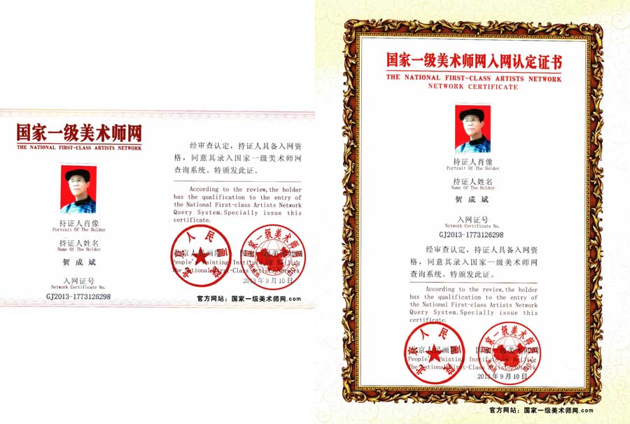 贺成斌,生于1950年,字霖旭,号瑞腾,山西省,大学文凭,中国基层党组织党风兼政特约记者,现为中国现代书画名家名作编辑委员会委员,自幼酷爱书画,笔耕不辍,一直从事剧团美工,拜书法家马文玉老先生为师,在他的多次指导,后有起见。1999年简历入选《世界当代书画篆刻家大辞典》与《中韩书画名家大典》之中;2007年授予《中国名家书画院》、《一级书画师》和《世界书画名人》荣誉证书称号;2009年授予《中国艺术协会》名誉主席;2011年特聘任为《中国艺术学院》博士生导师;2012年被国家专业技术人才职业资格认定委员会,认定《高级书画师》、《中国逻辑与语言函授大学艺术系》讲师,现兼任稷王书画院院长。