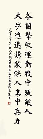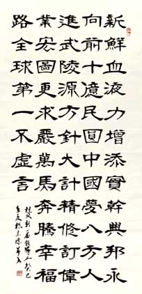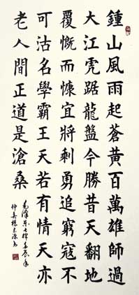 杨宗源,男,1938年9月生,汉族,云南呈贡人,自幼酷爱书法,小学时楷书基础好,五八年在部队学仿宋美术字,自学隶书,退休前坚持习作,退休后主攻楷书,兼学行草;2005年至今,先后在县老年大学书法班学习三年,任教两年,在省老大书法研讨班一年,行草班两年,书法与欣尝,篆刻,电脑,文学,诗词班各一年。
