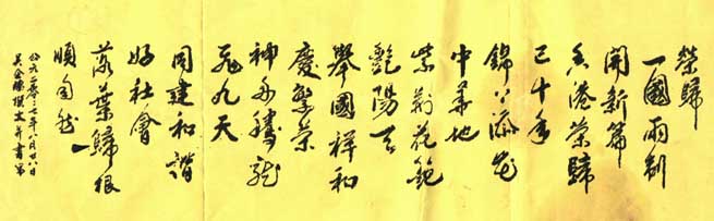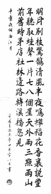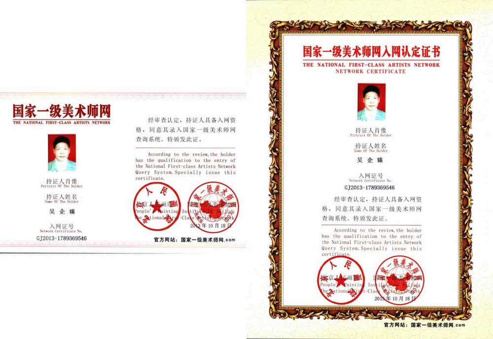 吴企臻,男,退休教师,1947年12月,自号半园主,半园翁,爱写毛笔字,曾临颜、柳、欧、赵诸体和王羲之《神龙帖》,于2003年参加了各大书院所举办的全国性书法大赛十余次,次次获奖,无一落空,其中一等奖(含金奖)8次,二等奖(含银奖)6次,优秀奖若干次,书法作品在《中国当代书法家作品选集》等十余种大型书画集中入编书法作品《盼》,入选世界文化艺术研究中心相关资料也入编《世界优秀管理人才》,本人是马鞍山市书法协会会员,安徽省硬笔书协会员、台海艺术协会会员、黄河书院研究员、本人的润格由九州枫林艺术研究会评定,每平方尺1800元。